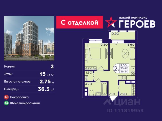 • ✓ В базе Циан 56 2-комнатных квартир на 15 этаже рядом с метро Ольгино