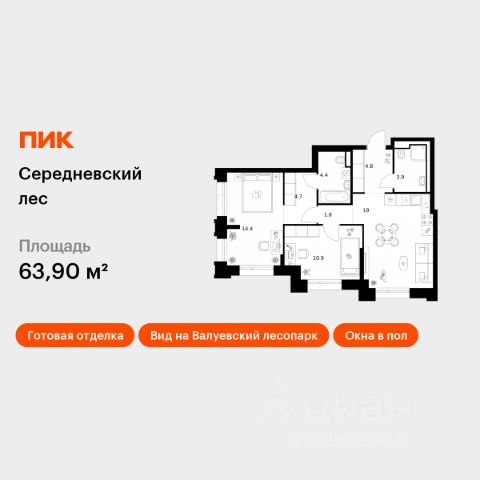 Продаётся 2-комн. квартира площадью 58,6 кв.м на 15 этаже 16 этажного дома (Корпус 2.1.4, Секция 4) проекта ПИК Середневский лес. Светлый просторный подъезд на уровне земли, функциональная планировка, большие окна, c отделкой. В 10 минутах на автомобиле находится станция метро "Внуково", а в 15 минутах — станции "Филатов Луг" и "Саларьево". От них до центра Москвы всего 3540 минут. На рейсовом автобусе от жилого квартала до метро "Филатов Луг" — 20 минут. На территории "Середневского леса" появилось общественное пространство с игровыми площадками, местами для отдыха, пешеходными маршрутами и велопарковкой — для прогулок, отдыха и встреч жителей квартала. Также внутри жилого квартала уже открыта школа на 1100 мест и детский сад для 325 малышей. В дальнейшем откроется ещё один сад для 340 детей. Артикул 1038204 (Застройщик ООО "Специализированный застройщик Середнево")