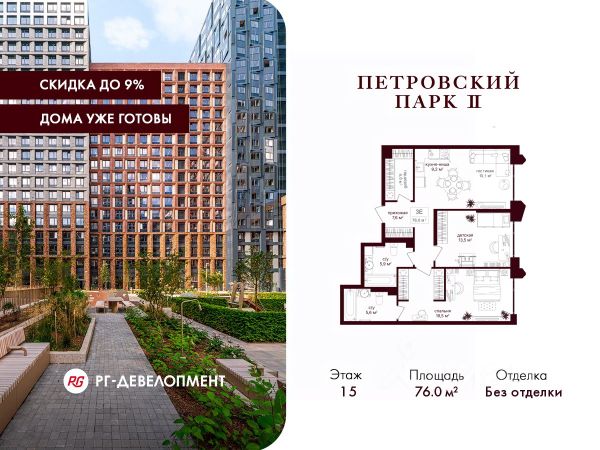 Продаётся 2-комнатная квартира 76,0 кв.м. в ЖК "Петровский парк II" на 15-м этаже 19 этажного дома. Скидка 9% при покупке квартиры! Цена указана с учетом максимального размера скидки. Компания "РГ-Девелопмент" предоставляет скидки на квартиры в жилом комплексе. Акция действительна с 01.11.2025г. до 30.11.2025г. включительно. Для того чтобы воспользоваться предложением, необходимо подписать договор на приобретение недвижимости до 30.11.2025г., включительно. ЖК "Петровский парк II" расположен в историческом районе Москвы, в 5 минутах от парка и станции метро "Динамо". Архитектуру от Syntaxis характеризуют асимметричные фасады, геометрические выступы, напоминающие волны. Эстетика архитектурных форм продолжается в интерьере внутренних пространств - двух центральных лобби и входных группах. На закрытой территории зеленые зоны с цветниками, места для отдыха, спортивные и игровые площадки. Подземная парковка, близость основных магистралей и удобные выезды, которые дают возможность жителям комплекса быть в центре культурной и общественной жизни. Комфортной жизни на территории комплекса расположены магазины, рестораны, частный детский сад.