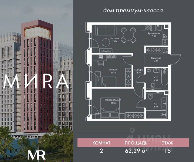 Прямая продажа от застройщика. Продаётся 2-комнатная квартира общей площадью 62.71 м² без отделки в доме премиум-класса МИRА на 15-м этаже 23 этажного дома. Квартира расположена в корпусе 2. Дом премиум-класса МИRA это: • Спокойный район с богатой историей и сложившейся инфраструктурой • Авторская архитектура на стыке классики и современности • Вход в парк прямо из жилого комплекса • Панорамные виды на Яузу, парки, ВДНХ и скульптуру "Рабочий и колхозница" • Удобные сервисы и безопасность для каждого резидента Расположение: Жилой квартал расположен в Алексеевском районе на северо-востоке Москвы, на второй линии домов, таким образом вы сможете дистанцироваться от шума и суеты проспекта Мира, но при этом будете жить недалеко от этой важной городской магистрали. Прямо у дома: • Парк Акведук • Река Яуза • Памятник "Рабочий и колхозница" Пешком: • 16 мин м. ВДНХ На автомобиле: • 12 мин ТТК • 15 мин Садовое кольцо • 12 мин Национальный парк "Лосиный остров" Благоустройство: Концепция благоустройства от бюро "ДРУЖБА" разработана в стиле "Лесная тропа". В уютном дворе расположились словно затерянные в лесу, площадки для отдыха. Они разделяются островками с травами, кустарниками, крупными камнями и деревьями, между которыми проходят узкие песчаные тропинки с деликатной подсветкой по вечерам. Центральной точкой притяжения для жителей станет главная площадь с фонтаном, которая открывается сразу из двух входных групп. Внутренний двор МИRA: • Детская площадка с зонами для игр малышей до трех лет и детей более старшего возраста • Спортивная площадка с профессиональным оборудованием для тренировок • Декоративные перголы • Воздушный арт-объект с подсветкой, похожий на облако • Чайный домик, где в отдельном отапливаемом павильоне можно в любое время года попить кофе с соседями или устроить камерное семейное чаепитие • Зоны для работы и отдыха с гамаком под навесом, скамейками и креслами Инфраструктура и окружение: В Алексеевском районе есть огромные благоустроенные парки, магазины, гимназии с высоким рейтингом и филиалы ВУЗов, частные и государственные детские сады, модные кофейни и фитнес-центры. В квартале МИRА предусмотрены: • 2 ресторана с видом на парк Акведук • 3 кафе • фитнес-студия • подземный паркинг на 330 машино-мест Компания MR предлагает своим клиентам специальные условия приобретения квартир в рамках программ ипотечного кредитования от банков-партнеров.