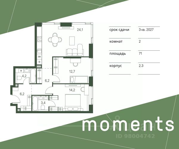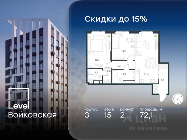 Цена указана с учётом скидки при 100%-й оплате, несубсидированной ипотеке, рассрочке (кроме программы "Рассрочка 0%"). Продается 2-комнатная квартира площадью 72.10 кв. м без отделки. Квартира находится на 15 этаже 20-этажного корпуса 3, в новом жилом комплексе бизнес-класса Level Войковская, расположенном рядом с живописным заповедником "Покровское-Стрешнево" (застройщик - компания Level Group/Левел групп). Прекрасная транспортная доступность - 7 мин. пешком до станции МЦК "Балтийская"; - 15 мин. пешком до станции метро "Войковская"; - 8 мин. на машине до ТТК; - 15 мин. на машине до центра Москвы; - 20 мин. на машине до Москва-Сити. Продуманный архитектурный проект - стильная архитектура от мастерской Фефелова В. В.; - панорамные виды на парки, Химкинское водохранилище и Останкинскую башню; - лобби с высотой потолков до 6,45 метров; - более 20 видов планировочных решений, включая редкие форматы квартир с террасой и увеличенной высотой потолков до 5,42 метров; - 2 варианта дизайнерской отделки в корпусе 4, предлагаются как дополнительная опция к отделке white box: стиль Modern в светлых холодных тонах и стиль Classic в нейтральной бежевой гамме. Квартиры в корпусах 3 и 5 сдаются без отделки. Расположение Level Войковская строится в престижном Северном округе Москвы. Развитая инфраструктура и живописная природа переплетаются в единый ансамбль, столь значимый для комфортной жизни. Войковский район окружают парки и набережные. В шаговой доступности - парк "Покровское-Стрешнево", не более 15-ти минут на велосипеде занимает путь до Тимирязевского парка и 9-ти минут до парка усадьбы Михалково. Рядом более 60 школ, 75 дошкольных учреждений, 17 государственных и 6 частных вузов, 25 супермаркетов, 4 торговых центра, среди которых ТЦ "Метрополис" и ТЦ "Авиапарк". Внутренняя инфраструктура На территории жилого комплекса предусмотрены коммерческие помещения: кафе, ресторан, пекарня и другие сервисы откроются на первых этажах корпусов. Для жителей будет доступен отапливаемый подземный паркинг на 244 машино-места с доступом с любого этажа на лифте. На территории паркинга будет расположено 125 кладовых помещений для хранения сезонного инвентаря. Лобби и благоустройство Дизайн лобби Level Войковская создан совместно с бюро BLANK. Это уютные гостиные, где хочется задержаться. Теплая цветовая гамма, ресепшен, зоны ожидания, лапомойки и гостевые санузлы - каждая деталь превращает лобби в комфортное продолжение вашего дома. 1,15 га площади в первых двух этапах строительства отведено под приватный внутренний двор, который спроектирован совместно с бюро "Правда". Детские площадки для всех возрастов, спортивные пространства для йоги, воркаута и петанка, уютные зоны для тихого отдыха или работы. Здесь утро начинается с вдохновения, а вечер наполнен приятными моментами. Лифты Комфортное перемещение внутри жилого комплекса будут обеспечивать надёжные лифты с доступом в паркинг с жилых этажей. В каждом корпусе предусмотрено по 3 грузопассажирских лифта.