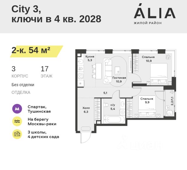 Продаётся 2-комнатная квартира 54.9 м². В жилом районе Алиа на 15-м этаже 30-этажного дома. Жилой район Алиа — это дома бизнес-класса у слияния Москвы-реки и Сходни. Алиа находится в Покровском-Стрешневе, экологически чистом районе на престижном северо-западе столицы. Район возводится на бывшей территории Тушинского аэрополя, где никогда не было промышленного производства. Алиа — это район разностороннего развития, спроектированный по принципу WORK.LIVE.PLAY.LEARN. Это "15-минутный город", где вся необходимая для комфортной жизни инфраструктура — на расстоянии приятной прогулки. У района удобное расположение: отсюда меньше 10 минут пешком до станций метро "Спартак" и "Тушинская" и всего полчаса на автомобиле до центра города или аэропорта Шереметьево. Архитектурную концепцию Алиа разработало бюро SOM (Skidmore, Owings & Merrill), авторы знаменитой "Бурдж-Халифа". В Алиа больше 140 планировочных решений, среди которых — редкие для Москвы форматы: квартиры с окном в ванной, пентхаус, сити-юниты и таунхаусы. Почти половина территории района отдана под благоустройство. В Алиа три парка: Линейный парк с кафе и магазинами, Центральный парк с амфитеатром, сухим фонтаном и большим плейхабом для детей всех возрастов и Прибрежный парк на собственной набережной, одной из самых длинных в Москве. В каждом урбан-блоке — закрытый внутренний двор с гипоаллергенными растениями и детской площадкой. В лобби каждого жилого корпуса в Алиа оборудована зона ожидания, колясочная, гостевой санузел и лапомойка для домашних животных. За стойкой ресепшена резидентов и их гостей встречает консьерж. Центральное лобби урбан-блока — это стильное общественное пространство с коворкингом, лаундж-зоной и кофе-пойнтом. Это "вторая гостиная" жителей урбан-блока и одно из мест, где формируется комьюнити Алиа. Два ключевых объекта инфраструктуры в Алиа — это спорткомплекс "Чкалов Арена", где представлены 25 видов спорта, и самый большой в стране бизнес-парк класса A, благодаря которому району обеспечено быстрое развитие.