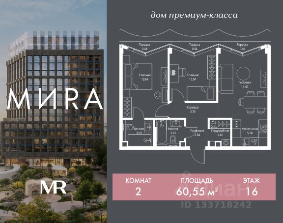 Прямая продажа от застройщика. Продаётся 2-комнатная квартира общей площадью 58.56 м² без отделки в доме премиум-класса МИRА на 16-м этаже 23 этажного дома. Квартира расположена в корпусе 2. Дом премиум-класса МИRA это: • Спокойный район с богатой историей и сложившейся инфраструктурой • Авторская архитектура на стыке классики и современности • Вход в парк прямо из жилого комплекса • Панорамные виды на Яузу, парки, ВДНХ и скульптуру "Рабочий и колхозница" • Удобные сервисы и безопасность для каждого резидента Расположение: Жилой квартал расположен в Алексеевском районе на северо-востоке Москвы, на второй линии домов, таким образом вы сможете дистанцироваться от шума и суеты проспекта Мира, но при этом будете жить недалеко от этой важной городской магистрали. Прямо у дома: • Парк Акведук • Река Яуза • Памятник "Рабочий и колхозница" Пешком: • 16 мин м. ВДНХ На автомобиле: • 12 мин ТТК • 15 мин Садовое кольцо • 12 мин Национальный парк "Лосиный остров" Благоустройство: Концепция благоустройства от бюро "ДРУЖБА" разработана в стиле "Лесная тропа". В уютном дворе расположились словно затерянные в лесу, площадки для отдыха. Они разделяются островками с травами, кустарниками, крупными камнями и деревьями, между которыми проходят узкие песчаные тропинки с деликатной подсветкой по вечерам. Центральной точкой притяжения для жителей станет главная площадь с фонтаном, которая открывается сразу из двух входных групп. Внутренний двор МИRA: • Детская площадка с зонами для игр малышей до трех лет и детей более старшего возраста • Спортивная площадка с профессиональным оборудованием для тренировок • Декоративные перголы • Воздушный арт-объект с подсветкой, похожий на облако • Чайный домик, где в отдельном отапливаемом павильоне можно в любое время года попить кофе с соседями или устроить камерное семейное чаепитие • Зоны для работы и отдыха с гамаком под навесом, скамейками и креслами Инфраструктура и окружение: В Алексеевском районе есть огромные благоустроенные парки, магазины, гимназии с высоким рейтингом и филиалы ВУЗов, частные и государственные детские сады, модные кофейни и фитнес-центры. В квартале МИRА предусмотрены: • 2 ресторана с видом на парк Акведук • 3 кафе • фитнес-студия • подземный паркинг на 330 машино-мест Компания MR предлагает своим клиентам специальные условия приобретения квартир в рамках программ ипотечного кредитования от банков-партнеров.