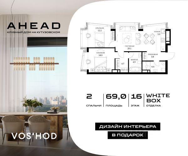 Апартамент в клубном доме премиум-класса AHEAD площадью 107,5 кв.м. на 16-м этаже с двумя спальнями и просторной кухней-гостиной. Потолок высотой 3,2 м. Панорамные окна выходят на Парк Победы и Москва-Сити откуда открываются потрясающие виды. Инженерное оснащение выполнено с учетом современных технологических решений: централизованная система кондиционирования VRF с возможностью регулировки температурного режима в каждом помещении, скрытые бесшумные воздуховоды, качественная звукоизоляция, устанавливаются внутрипольные конвекторы. Двухкамерные стеклопакеты Schco с алюминиевым профилем, обладают высокими показателями шумопоглощения и оснащены возможностью проветривания. Стекла покрыты светоотражающим напылением. Отделка White box.