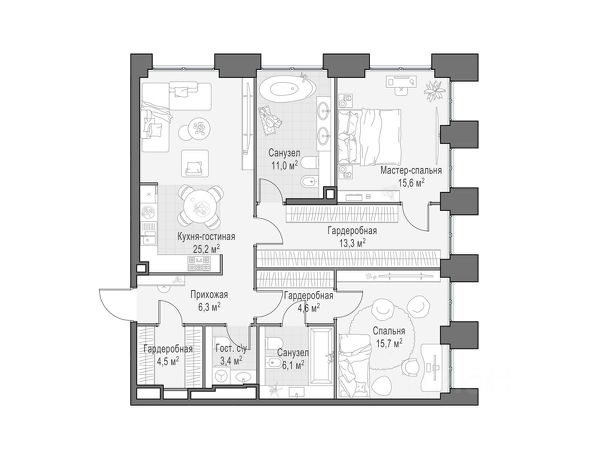 Просторная светлая квартира площадью 106,4 кв. м с окнами, выходящими в тихий приватный двор-парк с ландшафтным дизайном и на северную панораму города. Большое панорамное окно в с/у с возможностью открывания настежь улучшает видовые характеристики. Продуманная планировка позволяет разместить две спальни с отдельными санузлами и гардеробными. Life Time - роскошный современный квартал на Пресне, в наиболее быстро растущем премиальном районе ЦАО. Его насыщенная инфраструктура и выгодное расположение дарят время для жизни. Вы больше не тратите его на дорогу или ожидание, при этом ни в чём себе не отказывая. На территории предусмотрено всё для комфортной жизни: • двор-парк площадью 1,8 гектара с прудом и фонтанами; • Clubhouse - инфраструктурный центр в отдельном здании с исчерпывающими возможностями для спорта, отдыха и досуга только для жителей; • спортивная инфраструктура на улице и в помещении, в том числе бассейн длиной 25 метров, хот-таб, хаммам, сауна, бьюти-зона; • клубная гостиная с террасой; • всё для развития и досуга детей любого возраста, в том числе детский сад и школа. Life Time находится в центре сложившегося премиального района, в окружении многочисленных парков. Удобная транспортная доступность и прямой выезд на Звенигородское шоссе позволяют без проблем добраться до Садового кольца и Москва-Сити. Архитектурный стиль квартала - роскошный минимализм. Дома десятилетиями будут выглядеть современно.
