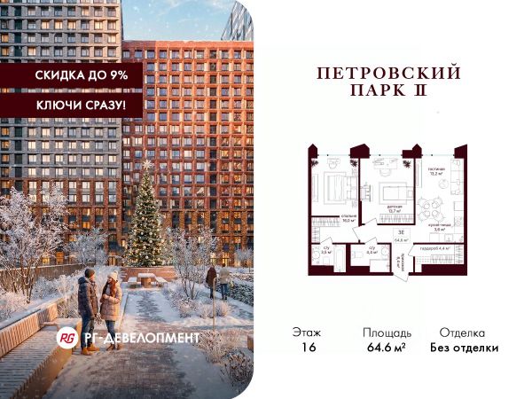 Рассрочка 0% + скидка 2%. Первый платёж 30%, второй - не позднее 31.12.2026 г. Продаётся 2-комнатная квартира 64.2 кв.м. в ЖК "Петровский парк II" на 16-м этаже 21 этажного дома. ЖК "Петровский парк II" — жилой комплекс в Савёловском районе, где город ощущается иначе. Здесь история и масштаб Москвы не давят, а задают фон для спокойной, уверенной жизни рядом с центром. Это место, где статус читается не в громких формулировках, а в окружении, архитектуре и ощущении пространства. Коротко о важном: • Район с глубоким историческим контекстом и парковым окружением; • 5 минут пешком до метро "Динамо", рядом с деловой и культурной жизнью города; • Редкое сочетание: энергия мегаполиса и тишина зелёных аллей; • Архитектура от бюро Syntaxis с пластикой форм и индивидуальным характером фасадов; • Панорамные виды на город и зелёные массивы Петровского и Тимирязевского парков; • Закрытый двор без машин, вдохновлённый эстетикой дворцовых садов; • Просторные гранд-лобби с высокими потолками и выверенной, респектабельной эстетикой; • Частный детский сад во дворе; • Подземный паркинг и кладовые; • РГ-Девелопмент - ТОП-20 крупнейших застройщиков Москвы. Расположение комплекса формирует особое ощущение свободы выбора. Утром - прогулка по тенистым аллеям Петровского парка, днём - работа и встречи в деловых кластерах поблизости, вечером - культурные события, рестораны и городские пространства в нескольких минутах пути. Здесь расстояния измеряются не километрами, а шагами от дома. Архитектура "Петровского парка II" задумана как современная доминанта района и одновременно как уважительный диалог с исторической средой. Асимметричные объёмы, волнообразные элементы и игра света и тени создают выразительный, но сдержанный силуэт. Архитектура наполнена воздухом и визуальным ритмом, оставаясь спокойной и уверенной. Общественные пространства продолжают эту логику. Два гранд-лобби с высокими потолками и благородной цветовой палитрой воспринимаются как пространства, где хочется замедлиться: встретить гостей, перевести дыхание после дня или просто почувствовать уровень среды, в которой вы живёте. Внутренний двор комплекса - это отдельный мир, закрытый от машин и городского шума. Ландшафтный дизайн отсылает к регулярным дворцовым садам: геометрия аллей, зелёные "кабинеты", цветники и камерные зоны отдыха создают разные сценарии для повседневной жизни. Здесь органично соседствуют детские игровые пространства, плейхаб, спортивные зоны и тихие места для отдыха. На территории комплекса расположены магазины, кафе и рестораны, а также частный детский сад, встроенный в общую структуру двора. Подземный паркинг и кладовые поддерживают ощущение порядка и цельности пространства.