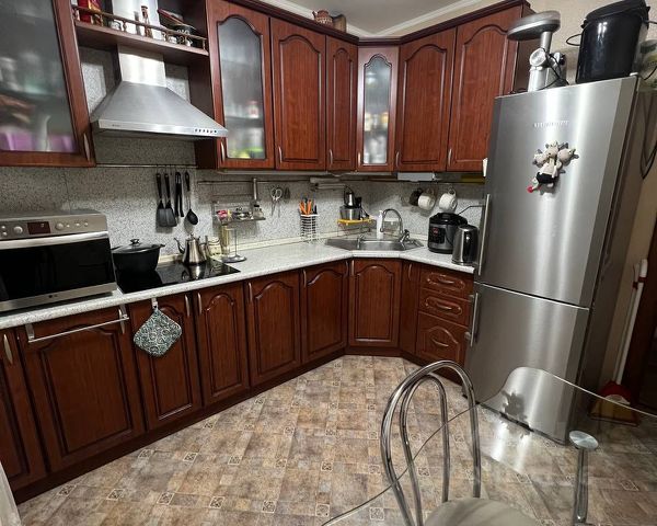 Двухкомнатная квартира панельного дома. Общая площадь 53 кв.м.: 1 комната изолированная, 2-я комната совмещена с кухней -студия ( перепланировка зарегистрирована ). Увеличили с 18 кв.м. до 22 кв.м. кухню уменьшили. Так же совместили санузел. Кухня 5.9 кв.м. Жилая 33.1 кв. м. Везде стеклопакеты. Окна выходят во двор. Застекленная лоджия. Из мебели остается: кухонный гарнитур с плитой -духовка, стол со стульями , кондиционер, шкаф купе в коридоре и шкаф в комнате , вся ванная мебель ( раковина с тубой и зеркало новое купили месяц назад) и стиральная машина.
