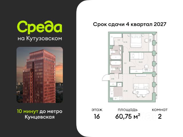 О квартире Продаётся двухкомнатная квартира общей площадью 60.75 кв. м. с отделкой на выбор: черновая, White Box. Квартира на 16 этаже корпуса 4.1 в жилом комплексе бизнес-класса "Среда на Кутузовском". До метро "Кунцевская" 10 минут пешком. Исторический зелёный район "Среда на Кутузовском" строится в Кунцево - историческом и экологически чистом районе Москвы. Здесь нет крупных производств, много лесных массивов и роза ветров, которая обеспечивает приток чистого воздуха. Район наполнен жизнью и уже развит: много детских садов и школ, поликлиники, магазины, кафе, спортивные объекты, парки. - 10 минут пешком до станции метро "Кунцевская". - 5-8 минут на машине до Кутузовского проспекта и Можайского шоссе и 10-15 минут до Рублёвского и МКАД. - 15 минут езды до Крылатских холмов, Суворовского парка и заказника "Долина реки Сетунь". Акции и спецпредложения - Выгода 12%: если внести 100% оплату или оформить семейную ипотеку под 6%. Действует до 13 апреля. - Низкие ставки по ипотеке: 0,1% в первый год или 0,11% в первые два года кредита. - Трейд-ин от "Среды": можно обменять свою текущую квартиру на новую. - Ипотека для семей с детьми: если ребёнку до 7 лет, предлагаем льготную ставку 3,5% О жилом комплексе "Среда на Кутузовском" - новый квартал с башнями от 12 до 44 этажей, окружённый лесными массивами и историческими усадьбами старой Москвы. Во внутреннем дворе есть водоём, многоуровневые зоны с детскими и спортивными площадками, коворкинг на свежем воздухе и локации для уединённого отдыха. Особенности - Архитектура с многослойными фасадами. - Квартиры с террасами и мастер-спальнями. - Окна в пол на всех этажах. - Общественные лаунж-гостиные. - Собственный ландшафтный парк во дворе. - Зоны барбекю и площадки для отдыха у воды. - Умный подземный паркинг. - Стрит-ритейл на первых этажах.