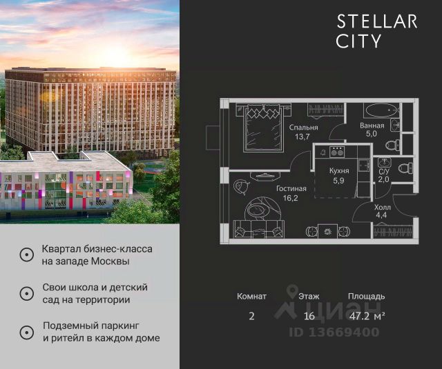 Продается квартира от надежного застройщика Tashir Estate в квартале бизнес-класса Stellar City в ЗАО Москвы. Площадь квартиры составляет: 46.1 кв. м, потолки: 3.1 м Квартира находится на 16 этаже, 4 корпуса жилого квартала Stellar City — микрогорода будущего на орбите Москвы. Stellar City — квартал в ЗАО Москвы вблизи инновационного центра Сколково. В окружении — 11 парков и природных зон, в том числе Долина реки Сетунь, Мещерский лес и парк развлечений The Rink. Город в городе Чтобы дом и инфраструктура вокруг отвечала динамичному лайфстайлу жителя мегаполиса, в основу проекта легла концепция город в городе, которая позволяет решать все бытовые вопросы in-home. В квартале будут возведены школа и детский сад, воркаут-зоны, променад, вело и беговые дорожки, детские площадки для каждого корпуса, а также коммерция на первых этажах для ежедневных покупок. Все необходимое — на расстоянии нескольких шагов. Изящные и лаконичные лобби Авторский дизайн, натуральные материалы в отделке и безупречный интерьер вне времени. Лобби и холлы в проекте бизнес-класса Stellar City ничем не отличаются от входных групп в премиум-сегменте благодаря качественным европейским материалам в отделке, стильному дизайну, консьерж-сервису и уютной зоне ожидания с журнальными столиками и мягкой мебелью. Комфорт и безопасность Закрытая территория, охрана, система СКУД, специально разработанное мобильное приложение дома для резидентов и подземный паркинг с круглосуточным наблюдением и доступом с помощью автоматического считывания номера авто.