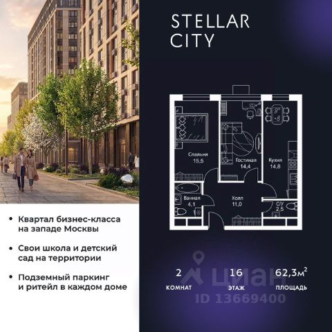 Продается квартира от надежного застройщика Tashir Estate в квартале бизнес-класса Stellar City в ЗАО Москвы. Площадь квартиры составляет: 46.1 кв. м, потолки: 3.1 м Квартира находится на 16 этаже, 4 корпуса жилого квартала Stellar City — микрогорода будущего на орбите Москвы. Stellar City — квартал в ЗАО Москвы вблизи инновационного центра Сколково. В окружении — 11 парков и природных зон, в том числе Долина реки Сетунь, Мещерский лес и парк развлечений The Rink. Город в городе Чтобы дом и инфраструктура вокруг отвечала динамичному лайфстайлу жителя мегаполиса, в основу проекта легла концепция город в городе, которая позволяет решать все бытовые вопросы in-home. В квартале будут возведены школа и детский сад, воркаут-зоны, променад, вело и беговые дорожки, детские площадки для каждого корпуса, а также коммерция на первых этажах для ежедневных покупок. Все необходимое — на расстоянии нескольких шагов. Изящные и лаконичные лобби Авторский дизайн, натуральные материалы в отделке и безупречный интерьер вне времени. Лобби и холлы в проекте бизнес-класса Stellar City ничем не отличаются от входных групп в премиум-сегменте благодаря качественным европейским материалам в отделке, стильному дизайну, консьерж-сервису и уютной зоне ожидания с журнальными столиками и мягкой мебелью. Комфорт и безопасность Закрытая территория, охрана, система СКУД, специально разработанное мобильное приложение дома для резидентов и подземный паркинг с круглосуточным наблюдением и доступом с помощью автоматического считывания номера авто.