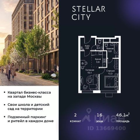 Продается квартира от надежного застройщика Tashir Estate в квартале бизнес-класса Stellar City в ЗАО Москвы. Площадь квартиры составляет: 46.1 кв. м, потолки: 3.1 м Квартира находится на 16 этаже, 4 корпуса жилого квартала Stellar City — микрогорода будущего на орбите Москвы. Stellar City — квартал в ЗАО Москвы вблизи инновационного центра Сколково. В окружении — 11 парков и природных зон, в том числе Долина реки Сетунь, Мещерский лес и парк развлечений The Rink. Город в городе Чтобы дом и инфраструктура вокруг отвечала динамичному лайфстайлу жителя мегаполиса, в основу проекта легла концепция город в городе, которая позволяет решать все бытовые вопросы in-home. В квартале будут возведены школа и детский сад, воркаут-зоны, променад, вело и беговые дорожки, детские площадки для каждого корпуса, а также коммерция на первых этажах для ежедневных покупок. Все необходимое — на расстоянии нескольких шагов. Изящные и лаконичные лобби Авторский дизайн, натуральные материалы в отделке и безупречный интерьер вне времени. Лобби и холлы в проекте бизнес-класса Stellar City ничем не отличаются от входных групп в премиум-сегменте благодаря качественным европейским материалам в отделке, стильному дизайну, консьерж-сервису и уютной зоне ожидания с журнальными столиками и мягкой мебелью. Комфорт и безопасность Закрытая территория, охрана, система СКУД, специально разработанное мобильное приложение дома для резидентов и подземный паркинг с круглосуточным наблюдением и доступом с помощью автоматического считывания номера авто.