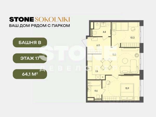 Старт продаж квартир в ЖК STONE SOKOLNIKI от девелопера STONE. В продаже просторная двуспальная квартира с кухней-гостиной и двумя спальнями для реализации любого дизайн-решения, идеально подходящая молодым парам, которые только планируют пополнение, а также небольшим семьям, где малыш уже подрастает. Современная архитектура проекта органично вписана в городскую среду. Концепция проекта разработана архитектурным бюро WALL Проект состоит из трех разновысотных башен высотой в 33, 28 и 24 этажа с чистой геометрией и увеличенной площадью остекления, которая позволит насладиться городской панорамой и видами на парк "Сокольники". Транспортная доступность - 10 мин. пешком до метро и БКЛ "Сокольники" и "Электрозаводская" - 12 мин. пешком до парка Сокольники - 10 мин. пешком до станции МЦД-3 "Митьково", которая позволит комфортно добираться в центр города и за его пределы Инфраструктура: В каждой входной группе предусмотрены помещения для временного хранения велосипедов, лапомойка, гостевой санузел, а также комната матери и ребенка. А колясочные появятся на каждом этаже - ведь это самое удобное решение для детей и их родителей. Планировочные решения: Планировки квартир в STONE Sokolniki создавались с учетом разнообразия современных сценариев жизни в городе. В проекте предусмотрены просторные кухни-гостиные, изолированные спальни с мастер-блоком, планировки для семей со взрослыми детьми, с двумя детьми разных возрастов. Благодаря грамотному зонированию квартир можно насладиться и временем с семьей, и уединением или, наоборот, устроить вечеринку вместе с друзьями. - Квартиры от 28 до 135 кв. м. Детский сад во дворе дома: Девелопер STONE осуществляет самостоятельный поиск оператора для детского сада, так как курирует наполнение проекта. На этапе финальной готовности будет выбран лучший оператор, отвечающий запросам качества и цены. Во всех своих проектах девелопер берет на себя ответственность за сдачу части помещений. Удобное хранение: В проекте STONE Sokolniki предусмотрена максимальная обеспеченность кладовыми. Хранения велосипедов в подземном паркинге возможно в зимний период, а летом будет организовано временное хранение на улице. Колясочные есть на каждом этаже всех трех жилых башен. - Колясочные на этаже - Кладовые для хранения Безопасная собственная территория дома, сим и паркинг: Внутри двора комфортно перемещаться пешком, все въезды в паркинг организованы по внешнему периметру. Велосипеды, самокаты и электросамокаты, детские беговелы и коляски - в приоритете, для всех колесных видов транспорта продуманы удобные маршруты движения и варианты хранения в разные сезоны. STONE - девелопер коммерческой и жилой недвижимости классов бизнес и премиум в Москве с 19-летним опытом. С 2022 года занимает лидирующую позицию на офисном рынке (рейтинг РБК). Сегодня в портфеле девелопера представлено 3 млн кв. м построенных, строящихся и проектируемых объектов, из которых более 1 млн кв. м находятся в стадии строительства. Компания имеет самый масштабный пр