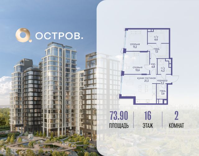 Продаётся двухкомнатная квартира от застройщика: общая площадь 73.90 м², жилая 24.80 м², кухня 21.30 м², 16, жилой квартал "Остров 12", корпус 3 (12.1 квартал) (секция 1). срок сдачи: 4-кв. 2025. , 2 санузла: 2 совмещенных. В жилой зоне 2 больших окна на одну сторону, хорошая инсоляция. Позвоните сейчас и забронируйте квартиру! Купите квартиру для курортной жизни в Москве в квартале ОСТРОВ.12.1. Это единственный на ОСТРОВЕ квартал бизнес-класса, расположенный на первой линии у реки - здесь царит атмосфера ежедневного отпуска. Дома созданы в узнаваемом футуристичном стиле и выглядят как произведения современного искусства. Для жителей предусмотрены фитнес-рум и детский клуб, гостиная и кинотеатр, переговорные и репетиторские комнаты. На крышах устроены видовые общественные пространства с зонами для йоги, коворкингами, лаунжами. Двор-парк располагает всем необходимым для отдыха и общения всех возрастов. ОСТРОВ.12.1 - часть жилого комплекса на западе Москвы, в 15 минутах езды от центра. Это настоящий заповедник посреди большого города, в окружении реки и 650 га заповедников. Здесь все необходимое находится по соседству: от детского сада до супермаркета, от фитнес-зала до серфинг-центра. На территории созданы все условия для отдыха и общения: клубная инфраструктура в домах и дворы-парки, набережные и променады, маршруты для спортсменов, детей и возрастных жителей. В нескольких минутах ходьбы расположена станция метро "Мнёвники" БКЛ. На автомобиле - 10 минут до Москва-Сити и 15 минут до Садового кольца.
