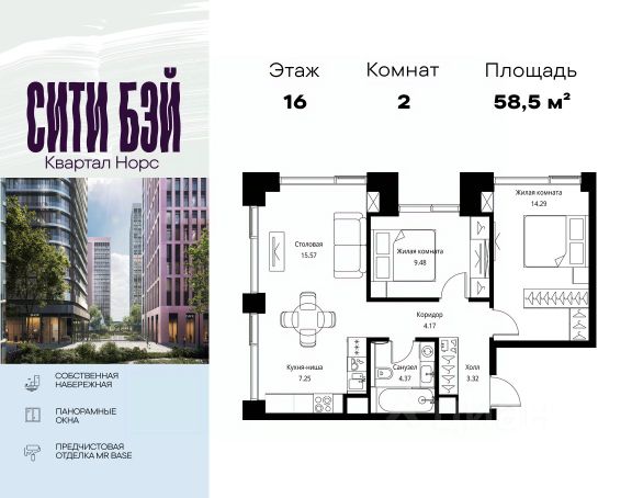 Прямая продажа от застройщика. Продаётся 2-комнатная квартира общей площадью 67.31 м² с предчистовой отделкой в ЖК Сити Бэй, квартале Норс, на 16-м этаже 27 этажного дома. Концепция жилого комплекса Сити Бэй - настоящий город в городе с отлично развитой инфраструктурой и собственной благоустроенной набережной. На территории жилого комплекса расположено пять кварталов - Атлантик, Пасифик, Индиан, Норс, Клиф. Жилой квартал Сити Бэй отличается оригинальной концепцией и выделяется среди других проектов такими характеристиками как: - Архитектура, - Виды из окон, - Природное окружение, вызывая гордость у жителей и восхищение у прохожих. Вся жизнь района Покровское-Стрешнево строится вокруг водных объектов: - Пойма реки Сходни с уникальной экосистемой, - Речка Химка и Химкинское водохранилище, - Москва-река, - Канал имени Москвы. Кругом вода, и местные с удовольствием этим пользуются. А сразу за рекой - центр водного спорта в Строгино с вейк-парком и яхт-Клубами. Помимо воды, здесь очень много зелени: - Рядом Сходненский ковш памятник природы, естественный амфитеатр глубиной 40 метров; - Парк при усадьбе Братцево с фруктовым садом; - Дубовая роща "Маяк", - Алешкинский лес; - Лесопарк Покровское-Стрешнево с пляжами и бобрами. Главные транспортные артерии района: - Волоколамское шоссе, - Таганско-Краснопресненская линия метро и МЦД-2. Всего за 20 минут можно добраться до центра на машине или метро, а МЦД связывает ЖК Сити Бэй с северными, восточными и юго-восточными районами. Компания MR предлагает своим клиентам специальные условия приобретения квартир в рамках программ ипотечного кредитования от банков-партнеров.