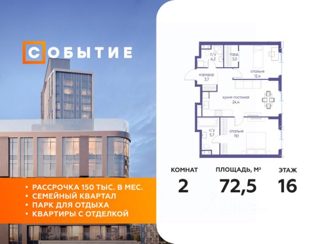 В продаже 2-к квартира от застройщика. Общая площадь 63.90, жилая 34.60, кухня 16.2. Квартира расположена на 16 этаже жилого квартала "Событие-6", корпус 1, Секция 1. Квартира без отделки. Срок сдачи: 4 кв. 2029 года. СОБЫТИЕ.6 — финальный дом парк-квартала СОБЫТИЕ на Мосфильмовской. Переезжайте в уже сформированный квартал с готовой инфраструктурой и парком! Премиальный жилой комплекс в престижном районе Москвы предлагает стильную архитектуру, продуманное благоустройство и великолепно разнообразие общественных пространств. Свой парк прямо возле дома! Архитектура Архитектура СОБЫТИЯ.6 выполнена в ультрасовременном стиле московским бюро Atrium на основе дизайн-кода британских архитекторов LDA Design и UHA London. Дом отличает оригинальная геометрия фасадов, большое остекление и высокие лобби (до 6,2 м) с авторской мебелью и светильниками. Расположение Мосфильмовская улица (Раменки) — один из престижных районов Москвы. Близость к историческому и деловому центру, природным зонам Запада столицы. Транспортная доступность: • 10 мин до Москва-Сити и ТТК; • 15 мин до Садового кольца; • 25 мин до аэропорта Внуково; • 7-10 мин до станций метро "Аминьевская" и "Мичуринский проспект". Инфраструктура: • парк "Событие" (12 га, финалист конкурса Правительства Москвы) с беговыми (1,5 км) и велодорожками (2,7 км), экотропой (1,6 км), площадками, лекторием; • школа, детский сад, магазины, салоны красоты, рестораны (к моменту заселения); • мультидвор с игровыми и спортивными площадками, мини-бульваром; • общественная терраса на 10-м этаже (коворкинг, лаунж); • Закрытые общественные пространства: детская комната, спортивный зал, коворкинг, лаунж-зоны. Паркинг 256 мест для жителей (48 — для электромобилей), 24 гостевых (5 — для электромобилей), мойки колес, кладовые, зоны для велосипедов. Окружение Парки и заповедники (Воробьёвы горы, Матвеевский лес и др.), МГУ, театр им. Н. И. Сац, стадион "Лужники". Безопасность Видеонаблюдение, контроль доступа, видеодомофоны, консьерж-сервис 24/7, системы пожарной безопасности и мультисервисная оптическая сеть.