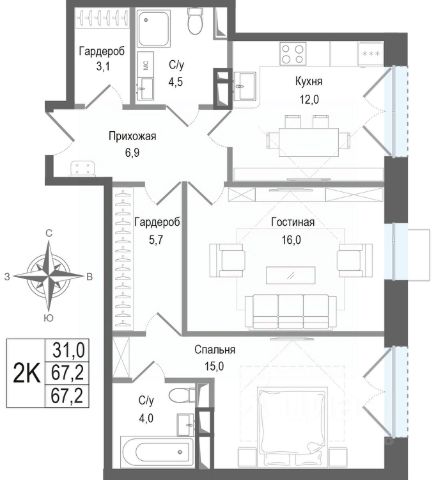 Продаётся 2-комнатная квартира в строящемся доме (Корпус 3), срок сдачи: II-кв. 2028, общей площадью 67.2 кв.м., на 2 этаже. ЖК "Киноквартал" , МО, г. Королев, мкр. Первомайский, ул. Солнечная, д. 2