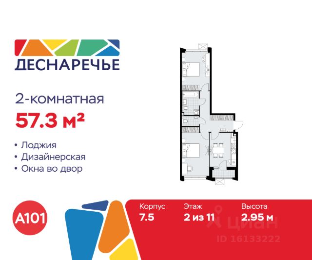 Продается двухкомнатная квартира 1264 в новостройке ЖК "Деснаречье" по адресу Москва, ТиНАО, Новомосковский АО, Десеновское С/П, Десна деревня, Москва, район Троицк, ЖК Деснаречье, к. 7.6. Общая площадь квартиры - 59.50 кв. м., этаж 2 из 11, секция 20. Тип проекта, по которому построен дом - монолит, компания-застройщик - ООО "А101". Стоимость квартиры - 23378740 Р. Срок сдачи - 3 квартал 2027. Масштабный ЖК "Деснаречье" состоит из 3 районов ("Парк", "Река" и "Лес") в живописном природном окружении - на берегах двух рек. На территории каждого района появится собственная развёрнутая инфраструктура и уникальное благоустройство: скверы, спортивные и игровые площадки, пешеходные и велосипедные маршруты. До станции метро "Десна" (открытие запланировано на 2027 год) - всего 10 минут пешком от района. На автомобиле до ст. метро "Ольховая" и "Прокшино" - 12 минут. "Фаст-трек" свяжет "Деснаречье" со спортивно-событийным кластером и бизнес-кварталом "Прокшино". В пешей доступности и на первых этажах домов откроются: супермаркеты, школы, детские сады, спортивная школа, медицинские клиники, кафе, пространства для досуга и развития детей и взрослых. Уже сейчас доступна действующая инфраструктура соседней локации. Это настоящий "15-минутный город", когда всё рядом. Для активного и созерцательного отдыха - живописные прогулочные территории в лесу, благоустроенные зоны вдоль рек Незнайка и Десна с пирсом и лодочной станцией, ФОК, термальный комплекс с бассейном. Закрытые дворы с системой контроля доступа свободны от машин, оснащены качественным спортивным и игровым оборудованием. Преимущества "Деснаречья": - ст. метро "Десна" (2027 год) - пешая доступность - 2 реки, природный парк, лесной массив - "15-минутный город" - вся инфраструктура рядом с домом - школы и детские сады, спортивная школа