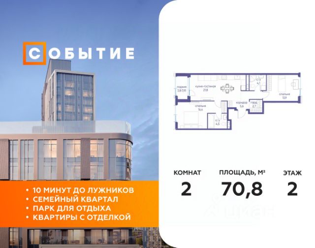 В продаже 2-к квартира от застройщика. Общая площадь 74.60, жилая 30.50, кухня 18.8. Квартира расположена на 2 этаже жилого квартала "Событие-6", корпус 2, 2. Квартира без отделки. Срок сдачи: 4 кв. 2029 года. СОБЫТИЕ.6 — финальный дом парк-квартала СОБЫТИЕ на Мосфильмовской. Переезжайте в уже сформированный квартал с готовой инфраструктурой и парком! Премиальный жилой комплекс в престижном районе Москвы предлагает стильную архитектуру, продуманное благоустройство и великолепно разнообразие общественных пространств. Свой парк прямо возле дома! Архитектура Архитектура СОБЫТИЯ.6 выполнена в ультрасовременном стиле московским бюро Atrium на основе дизайн-кода британских архитекторов LDA Design и UHA London. Дом отличает оригинальная геометрия фасадов, большое остекление и высокие лобби (до 6,2 м) с авторской мебелью и светильниками. Расположение Мосфильмовская улица (Раменки) — один из престижных районов Москвы. Близость к историческому и деловому центру, природным зонам Запада столицы. Транспортная доступность: • 10 мин до Москва-Сити и ТТК; • 15 мин до Садового кольца; • 25 мин до аэропорта Внуково; • 7-10 мин до станций метро "Аминьевская" и "Мичуринский проспект". Инфраструктура: • парк "Событие" (12 га, финалист конкурса Правительства Москвы) с беговыми (1,5 км) и велодорожками (2,7 км), экотропой (1,6 км), площадками, лекторием; • школа, детский сад, магазины, салоны красоты, рестораны (к моменту заселения); • мультидвор с игровыми и спортивными площадками, мини-бульваром; • общественная терраса на 10-м этаже (коворкинг, лаунж); • Закрытые общественные пространства: детская комната, спортивный зал, коворкинг, лаунж-зоны. Паркинг 256 мест для жителей (48 — для электромобилей), 24 гостевых (5 — для электромобилей), мойки колес, кладовые, зоны для велосипедов. Окружение Парки и заповедники (Воробьёвы горы, Матвеевский лес и др.), МГУ, театр им. Н. И. Сац, стадион "Лужники". Безопасность Видеонаблюдение, контроль доступа, видеодомофоны, консьерж-сервис 24/7, системы пожарной безопасности и мультисервисная оптическая сеть.
