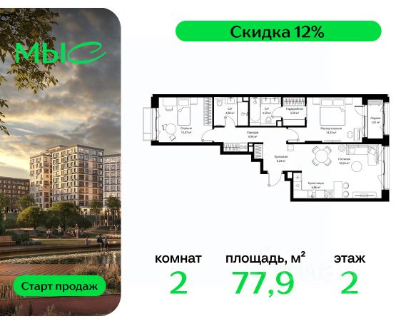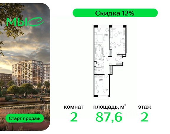 Прямая продажа от застройщика. Продаётся 2-комнатная квартира общей площадью 87.58 м² без отделки в премиальном жилом комплексе "МЫС" на 2-м этаже 12 этажного дома. Проект МЫС — это, прежде всего, идеальное место для семей. В рамках проекта построят государственную школу, два детских сада и дворец спорта площадью 20 000 м2 с термальным комплексом, выплывным бассейном, фитнес-залом, теннисными, сквош и падел кортами и секциями для детей. На территории площадью, сравнимой с тремя парками Зарядье, появятся кафе и рестораны, пруд с набережной, спортивные и детские площадки, скейт-парк, лыжные и веломаршруты. Расположение: - 2 минуты до скоростной трассы М1 и Минского шоссе; - 10 минут до МКАД; - 15 минут до МЦД Лесной Городок - 20 минут до делового центра "Москва-Сити"; - 28 минут до аэропорта "Внуково". Благоустройство: - велосипедные и лыжные маршруты; - собственная набережная и парк; - лаунж-зоны в окружении природы; - беседки у очага; - дворец спорта площадью 20 000 м²; - термальный комплекс с тремя бассейнами; - 4 теннисных и падел-корта; - 6 сквош-кортов; - многофункциональный спортзал; - скейт-парк; - просторная площадь для прогулок с фонтаном; - детский Клуб с творческими секциями; - гастро-доминанта; - кафе у пруда, рестораны, ритейл. Окружение - соседство с лесным фондом; - школа на 1250 мест и 2 детских сада на 350 и 255 мест; - Дубковский и Подушкинский леса, парк "Рассказовка", Мещерский парк. Действуют специальные условия при 100% оплате, подробности уточняйте у менеджера в офисе продаж.
