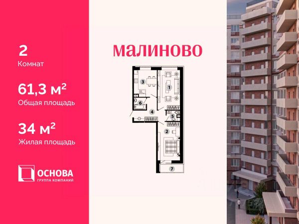 Продается 2-комн. кв-ра площадью 61,5 кв.м на 2 этаже 12 этажного монолитно-кирпичного дома в ЖК "Малиново". АО ГК ОСНОВА является крупным застройщиком Москвы и Московской области. В девелоперском портфеле Компании на разных стадиях реализации сегодня находятся 20 жилых проектов в столичном регионе площадью порядка 2 млн м2, а также один реализованный проект в Чехии. Проект ЖК "Малиново" один из 20 проектов АО ГК ОСНОВА, он представляет собой 12-ти этажный кирпично-монолитный жилой комплекс, который находится в одном из наиболее экологически чистых районов Подмосковья - Звенигороде. Комплекс расположен в микрорайоне Восточный, в 5 минутах до ЦКАД и в 42 км от МКАД. Сердце города находится буквально в пятнадцати минутах ходьбы от месторасположения ЖК. ЖК "Малиново" располагается в районе с развитой инфраструктурой и хорошей транспортной доступностью. Поблизости находятся детские сады, школы, медицинские учреждения, торговые комплексы, магазины, культурный центр, спорткомплекс, бассейн и памятник природы - Мозжинский овраг. Недалеко от города - горнолыжные трассы, спуски для снегокатов. В 7 минутах ходьбы от ЖК строится новая школа, ввод в эксплуатацию 2024 год. Приобретая квартиру в ЖК "Малиново" вы обретаете комфортный стиль жизни в центральной части города. Становитесь счастливым обладателем квартиры с видом на Москву-реку, а также с лоджией с панорамными окнами. Звоните и получите подробную консультацию, специалисты отдела продаж помогут выбрать наиболее подходящий вариант! Дистанционное оформление ипотеки, рассрочка и другие варианты покупки для вашего удобства.