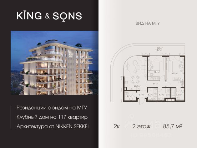Продается двухкомнатная квартира общей площадью 50,4 м2 на 3 этаже дома премиум-класса Legacy в районе Раменки. Холл 4,5 м2 создает уют и комфорт с первых шагов. А правильно организованные встроенные системы хранения делают каждый квадратный метр холла продуманным и вместительным. Просторная кухня-гостиная 20.1 м2 для времяпровождения всей семьей за ужином, настольными играми или встреч с друзьями. Приватная спальная комната 20,8 м2, располагающая к отдыху и восстановлению сил. Для удобства будущих резидентов доступны два варианта отделки от застройщика: Premium и Elite премиальные материалы в отделке, мебель от европейских производителей, и освещение индивидуального изготовления. Жилой комплекс Legacy располагается на Мичуринском проспекте в районе с развитой инфраструктурой, богатой историей и высокой транспортной доступностью. Москва-река, Ботанический сад МГУ, главный корпус МГУ и Воробьевы горы на расстоянии прогулки от комплекса. Проект состоит из 9 секций переменной этажности от 8 до 17 этажей. В каждой секции не более 5 квартир на этаже, что обеспечивает высокий уровень приватности. Архитектура Проект Legacy разработан архитектурным бюро Speech. Его строгая лаконичность дополнена современными стандартами роскошной и комфортной жизни это бессменная классика, которая всегда вне моды. Благоустройство Свой приватный двор-сквер площадью 3 600 м2 с пространствами для всех возрастов: на территории располагаются игровые площадки, детский городок, песочница, воркаут-зоны, батуты, места для отдыха, лабиринты, настольный теннис и шахматные столы. Презентабельные лобби Дизайнерские лобби и холлы с премиальной отделкой. Изысканный стиль и высококачественные европейские материалы, отражающие высокий статус резидентов дома. Инфраструктура в доме Магазины, салон красоты, спортивная студия на первом этаже. А также ресторан Seasons, который позволяет разнообразить рацион и сделать каждый ужин особенным. Комфорт и безопасность Премиальный консьерж-сервис 24/7, круглосуточная охрана, видеонаблюдение, система СКУД, закрытый охраняемый паркинг и эксклюзивное мобильное приложение для решения бытовых вопросов резидентов.