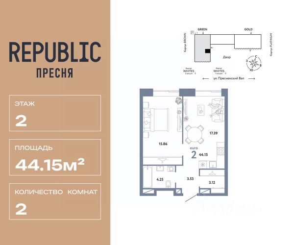 Новая квартира в ЖК "Republic" напрямую от федерального застройщика "Страна Девелопмент". Продается 2комнатная квартира на 2 этаже от застройщика Страна Девелопмент. Площадь квартиры 45,24 кв. м. Дизайн-квартал "Republic" — новый проект премиум-класса в Москве. 10 жилых башен и 4 восстановленных здания локомотивного депо образуют уникальное пространство. "Republic" — место, где вы ощутите гармонию истории и современности. Детский сад, SPA-комплекс с бассейном, гастрономический и шопинг-центры, собственный бульвар и яркие арт-пространства — для жителей предусмотрены все элементы премиального комфорта. Преимущества Уникальная жизненная среда, где инфраструктура включает гастрономию, SPA-комплекс с термами, образовательные и развлекательные заведения, арт-пространство и шопинг-аллеи. Двор от британского бюро "Gillespies": на 4 гектарах закрытого двора расположится 7 игровых зон для разных возрастов с ручьем и сухим фонтаном, арт-галерея под открытым небом и большой прогулочный бульвар. Лобби с террасой в башнях "Reds" — лаконичное пространство галереи-лобби, где можно проводить деловые и дружеские встречи, не нарушая приватности квартиры. В тёплое время года не остаётся пустующей терраса на крыше, которая привлекает непринуждённой атмосферой и прохладительными напитками в баре. Клубная гостиная — стильное пространство оборудовано кухней и залом для торжеств на 40 человек, а для того, чтобы побыть наедине с собой, почитать книгу или провести онлайн-встречу в гостиной оборудована мастерская с библиотекой. Уникальные форматы квартир, где можно реализовать любой жизненный сценарий: от стильного офиса в двухэтажной квартире до угловых лотов с просторными гостиными. А эксклюзивные пентхаусы с высокими потолками и панорамными окнами дарят захватывающие виды на Москву.. Отделка Квартиры сдаются без отделки или в формате White box. При отделке White box уже были выполнены все шумные и грязные работы руками наших специалистов: произведена разводка электричества с установкой подрозетников, установлены откосы из гипсокартона, устроена стяжка пола с шумоизоляцией. Способы покупки Сотрудники "Страна Девелопмент" будут сопровождать вас на каждом этапе сделки, помогут получить одобрение по ипотеке или снизить ежемесячный платеж. - ипотека - рассрочка - с использованием материнского капитала - 100% оплата наличными