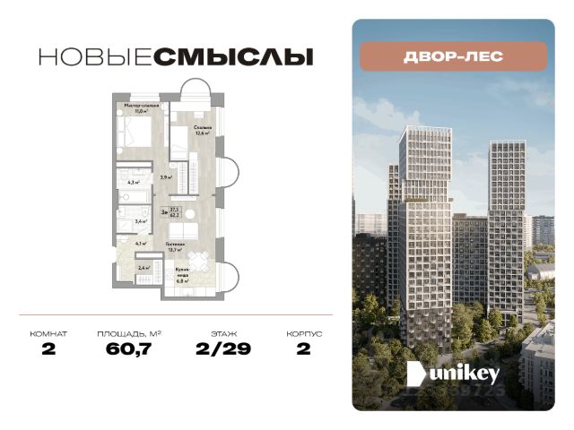 В жилом комплексе, расположенном по соседству с ландшафтным парком "Южное Бутово", продается 2-комнатная квартира площадью 62.10 кв. м. без отделки. Квартира расположена на 2 этаже 1 корпуса в жилом квартале комфорт-класса "Новые Смыслы" (ГК Unikey/Юникей). Доступная и удобная локация: - 10 минут ходьбы до станции метро "Потапово". - 25 минут ходьбы до станции метро "Бунинская аллея". - 15 минут на авто до Калужского шоссе. - 20 минут на авто до МКАД. - 30 минут на машине до аэропортов "Внуково" и "Остафьево". Продуманный архитектурный проект: - Разноуровневые секции с эстетичные башнями и контрастными цветовыми сочетаниями, напоминающими башни в Сити. - Сказочные виды из окон на современный район столицы. - Авторские планировки с потолками в 3 метра, просторными кухнями-гостиными и мастер-спальнями. - Комфортные бесплатные общественные пространства. - Подземный паркинг с прямым доступом на лифте. - Настоящий лес с живописными пейзажами и прудом прямо во дворе. Расположение Комплекс "Новые Смыслы" расположится в благоприятном районе Новой Москвы - Коммунарка. Зеленое окружение, богатая инфраструктура развивающегося района - все это сформирует особое пространство для комфортной жизни, наполненной смыслом. 10 минут на велосипеде - и вы в ландшафтном парке "Южное Бутово" или сквере у Потаповских прудов. Чуть дальше расположен Бутовский лесопарк. В окружении "Новых Смыслов" вы найдете все необходимые социальные объекты. В двух шагах от дома находится 5 школ, более десятка детских садов, секции для занятий малышей и подростков, частные клиники, супермаркеты, рестораны, студии красоты и фитнес-центры. За 12 минут на авто вы доберетесь до ледовой арены, комплекса "Спорт Станция" и спа-центра "Termoland". Внутренняя инфраструктура Для жителей "Новых Смыслов" будут созданы бесплатные общественные пространства: - Деловая гостиная с эстетичным коворкингом и переговорными. - Гостиная для души и тела, включающая фитнес-зону с тренажерами и пространства для стретчинга, йоги и медитаций. - Гостиная детства, где дети будут играть и развиваться под присмотром тьютора. - Кино-гостиная - кинотеатр на крыше одного из домов, предлагающий разнообразную программу. - Прачечная, работающая только для жильцов. Вместе с корпусами комплекса на территории запланировано строительство детского сада. На первых этажах корпусов откроются кофейни, пекарни, сервисы быта и пункты доставки. Благоустройство Чтобы отдохнуть от суеты города, достаточно выйти во двор: здесь раскинулся настоящий лес с живописными пейзажами. В тени деревьев жителей ждут пруд с мостиком и беседкой на берегу, тихие прогулочные аллеи, спортивная площадка и зоны для занятий йогой и бадминтоном на свежем воздухе. Юных жителей порадуют современные детские площадки, жукарий и специальное пространство для подвижных игр. Безопасность на территории гарантирована: двор огорожен от машин и оснащен камерами видеонаблюдения.