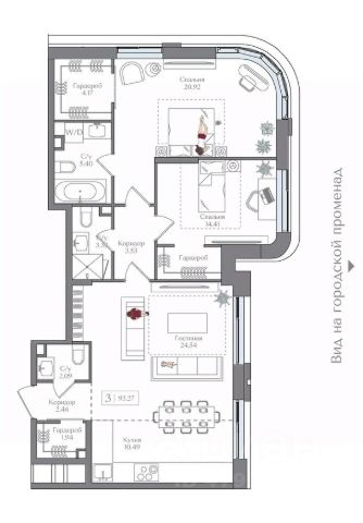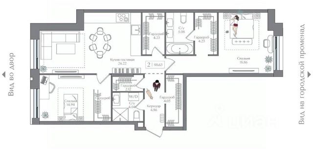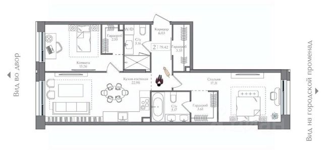 Функциональная планировка :спальня + зал + кухня-гостиная, много систем хранения.