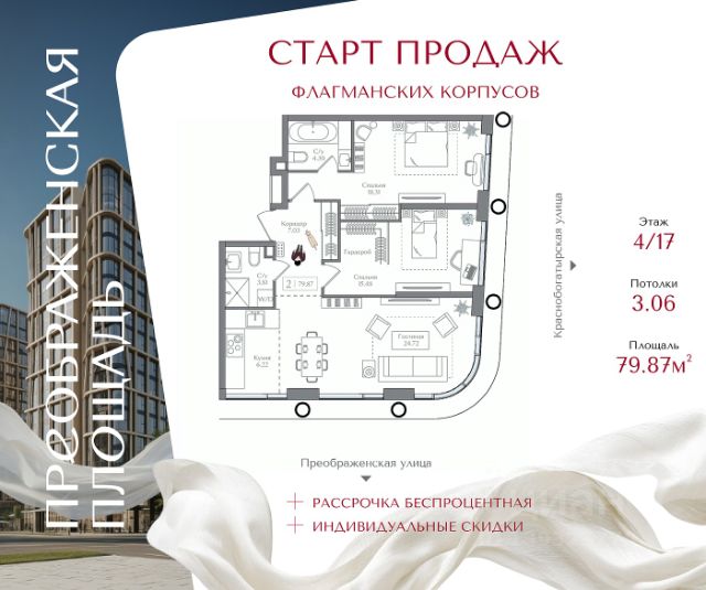 Предложения месяца от девелопера: - Ипотека от 3,5% на весь срок или 0,11% на первый год - Рассрочка без процентов - Trade-in с проживанием на время строительства дома Просторная 2-комнатная квартира для молодой семьи. Общая площадь - 50.3 м2. на 4 этаже, без отделки. Эргономичные планировки, мастер-спальни с гардеробной и санузлом, угловые комнаты и террасы с видами на город и национальный парк "Лосиный остров". НАЗАРЕ' - шесть домов бизнес-класса высотой 24-43 этажа. Проект расположен в окружении трёх парков: "Лосиный остров", "Сокольники" и "Измайловский". Территория НАЗАРЕ' приватный двор-сад с авторским благоустройством. Здесь появится сеть прогулочных дорожек, зоны тихого отдыха и медитации, игровые и спортивные площадки и коворкинг на свежем воздухе. В продаже квартиры с мастер-спальнями, кухнями-гостиными, открытыми террасами и просторными кладовыми. Форматы - от светлых студий 21,5 м2 до семейных 4-комнатных 125, 5 м2. Часть лотов - с предчистовой отделкой. Транспортная доступность: - Метро "Бульвар Рокоссовского" и МЦК - 2 мин. пешком - Северо-Восточная хорда - 3 мин. на автомобиле - Третье транспортное кольцо - 15 мин. на автомобиле - Садовое кольцо - 18 мин. на автомобиле Инфраструктура: - Собственный детский сад. - Собственный торгово-развлекательный центр с акцентом на шопинг и досуг в шаговой доступности. Здесь появятся различные ресторанные концепции, фитнес-клуб и детская игровая зона. - На первых этажах домов откроются кафе, пекарни, магазины и службы сервиса. - Общественная гостиная с мягкой мебелью и детской игровой. - Фитнес-зона для индивидуальных и групповых занятий. - Двухуровневый подземный паркинг с келлерами для хранения сезонных вещей. - В районе Богородское находятся престижные школы, медцентры, магазины и спортивные клубы.
