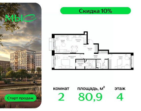 Прямая продажа от застройщика. Продаётся 2-комнатная квартира общей площадью 83.08 м² без отделки в премиальном жилом комплексе "МЫС" на 4-м этаже 6 этажного дома. Квартира расположена в клубном доме 10. Особенности квартир в клубном доме: - Приватная благоустроенная территория со своим выходом в лес; - Высота окон 3 метра, окна в пол. Ширина от 3-х метров; - Просторные лоджии и террасы; - Все квартиры видовые; - Двухуровневые квартиры со входом с террасы первого этажа; - Камины на верхних этажах; - Максимальное количество квартир на этаже от 2-4. Проект МЫС — это, прежде всего, идеальное место для семей. В рамках проекта построят государственную школу, два детских сада и дворец спорта площадью 20 000 м2 с термальным комплексом, выплывным бассейном, фитнес-залом, теннисными, сквош и падел кортами и секциями для детей. На территории площадью, сравнимой с тремя парками Зарядье, появятся кафе и рестораны, пруд с набережной, спортивные и детские площадки, скейт-парк, лыжные и веломаршруты. Расположение: - 2 минуты до скоростной трассы М1 и Минского шоссе; - 10 минут до МКАД; - 15 минут до МЦД Лесной Городок - 20 минут до делового центра "Москва-Сити"; - 28 минут до аэропорта "Внуково". Благоустройство: - велосипедные и лыжные маршруты; - собственная набережная и парк; - лаунж-зоны в окружении природы; - беседки у очага; - дворец спорта площадью 20 000 м²; - термальный комплекс с тремя бассейнами; - 4 теннисных и падел-корта; - 6 сквош-кортов; - многофункциональный спортзал; - скейт-парк; - просторная площадь для прогулок с фонтаном; - детский клуб с творческими секциями; - гастро-доминанта; - кафе у пруда, рестораны, ритейл. Окружение - соседство с лесным фондом; - школа на 1250 мест и 2 детских сада на 350 и 255 мест; - Дубковский и Подушкинский леса, парк "Рассказовка", Мещерский парк. Действуют специальные условия при 100% оплате, подробности уточняйте у менеджера в офисе продаж.