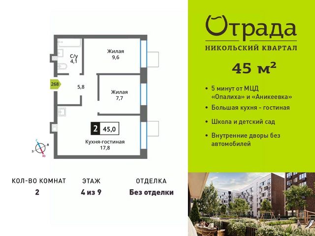 Двухкомнатная квартира (евротрешка) с просторной кухней-гостиной и двумя санузлами в жилом комплексе бизнес-класса Сити квартал Отрада. Планировка квартиры выполнена по современным стандартам и отличается повышенным комфортом. Квартал состоит из трех 31-этажных башен, вырастающих из единого основания, на вершине которого разместился приватный двор с доступом только для резидентов. На 31 этаже каждой из башен располагаются уникальные пентхаусы. Благоустройство закрытого двора включает в себя прогулочные дорожки, уютные зоны отдыха, разнообразные детские и спортивные площадки, а также собственную инфраструктуру на первых этажах дома - магазины, кафе, рестораны и фитнес-клуб. Проектом предусмотрен многоуровневый подземный паркинг с кладовыми помещениями. Идеальное расположение комплекса в сердце города сочетает в себе все преимущества комфортной жизни с прямым доступом к инфраструктурным, транспортным и культурным объектам. Надежный застройщик ГК "Отрада" с высочайшим рейтингом 5 звезд от портала ЕРЗ. Все корпуса во всех ЖК сданы раньше срока!