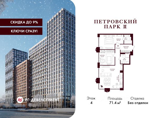 Рассрочка 0%. Первый платёж 30%, второй - не позднее 31.12.2026 г. Продаётся 2-комнатная квартира 68.4 кв.м. в ЖК "Петровский парк II" на 4-м этаже 15 этажного дома. ЖК "Петровский парк II" — жилой комплекс в Савёловском районе, где город ощущается иначе. Здесь история и масштаб Москвы не давят, а задают фон для спокойной, уверенной жизни рядом с центром. Это место, где статус читается не в громких формулировках, а в окружении, архитектуре и ощущении пространства. Коротко о важном: • Район с глубоким историческим контекстом и парковым окружением; • 5 минут пешком до метро "Динамо", рядом с деловой и культурной жизнью города; • Редкое сочетание: энергия мегаполиса и тишина зелёных аллей; • Архитектура от бюро Syntaxis с пластикой форм и индивидуальным характером фасадов; • Панорамные виды на город и зелёные массивы Петровского и Тимирязевского парков; • Закрытый двор без машин, вдохновлённый эстетикой дворцовых садов; • Просторные гранд-лобби с высокими потолками и выверенной, респектабельной эстетикой; • Частный детский сад во дворе; • Подземный паркинг и кладовые; • РГ-Девелопмент - ТОП-20 крупнейших застройщиков Москвы. Расположение комплекса формирует особое ощущение свободы выбора. Утром - прогулка по тенистым аллеям Петровского парка, днём - работа и встречи в деловых кластерах поблизости, вечером - культурные события, рестораны и городские пространства в нескольких минутах пути. Здесь расстояния измеряются не километрами, а шагами от дома. Архитектура "Петровского парка II" задумана как современная доминанта района и одновременно как уважительный диалог с исторической средой. Асимметричные объёмы, волнообразные элементы и игра света и тени создают выразительный, но сдержанный силуэт. Архитектура наполнена воздухом и визуальным ритмом, оставаясь спокойной и уверенной. Общественные пространства продолжают эту логику. Два гранд-лобби с высокими потолками и благородной цветовой палитрой воспринимаются как пространства, где хочется замедлиться: встретить гостей, перевести дыхание после дня или просто почувствовать уровень среды, в которой вы живёте. Внутренний двор комплекса - это отдельный мир, закрытый от машин и городского шума. Ландшафтный дизайн отсылает к регулярным дворцовым садам: геометрия аллей, зелёные "кабинеты", цветники и камерные зоны отдыха создают разные сценарии для повседневной жизни. Здесь органично соседствуют детские игровые пространства, плейхаб, спортивные зоны и тихие места для отдыха. На территории комплекса расположены магазины, кафе и рестораны, а также частный детский сад, встроенный в общую структуру двора. Подземный паркинг и кладовые поддерживают ощущение порядка и цельности пространства.