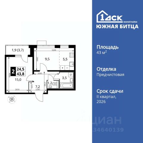Прямая продажа от застройщика! Семейный жилой район класса Комфорт Плюс Продаётся 2-к квартира номер 18 общей площадью 43.8 кв.м. на 4-м этаже 22 этажного здания. Отделка Whitebox. Особенности квартиры: - Линейная планировка - максимальная функциональность и удобство. - Увеличенное количество окон - дополнительное освещение и свежий воздух. - Гостевой санузел - комфорт и удобство для ваших гостей. - Раздельный санузел - больше удобства для всех членов семьи. - Евроформат - просторное и удобное жилье с отличной планировкой. - Ниша под шкаф - компактное и удобное место для вещей. - Лоджия - уютное место для отдыха и тишины. Квартира с предчистовой отделкой (White box). Вам не придется заниматься черновыми и трудоёмкими работы, а чистовую отделку и дизайн - сделайте на свой вкус. Информация о комплексе: Сочетание свободного перемещения по внутреннней территории без машин и ощущения абсолютной безопасности благодаря надежным ограждениям - вот что отличает ЖК Южная Битца. На территории комплекса созданы все условия как для активного образа жизни, так и для спокойного времяпрепровождения. Свободно перемещайтесь по внутренней территории в безбарьерной среде! Продуманное зонирование во дворах позволяет отделить тихие зоны для родителей со спящими младенцами и тех, кто хочет почитать на свежем воздухе, от шумных игровых зон. Игровые зоны учитывают возраст детей. Площадки для детей старшего возраста вынесены за пределы дворов. Ощущение уютного дома должно начинаться с подъезда. Мы постарались предусмотреть все нюансы, чтобы наши лифты отвечали самым строгим современным требованиям. А наличие кладовых позволит вам поддерживать идеальный порядок и уют в вашей квартире! Транспортная доступность: В 3 км от МКАД в нескольких минутах езды до трех станций метро: Аннино, Бульвар Дмитрия Донского, улица Старокочаловская и станции МЦД2 - жд Бутово. Внутренняя инфраструктура: Для жителей жилого района "Южная Битца" доступна развитая инфраструктура близлежащих московских районов Чертаново, Южное, Бирюлёво Западное, Северное Бутово и Южное Бутово. Множество образовательных учреждений, объекты здравоохранения, торговые и развлекательные центры, кинотеатры, кафе, рестораны, парки.