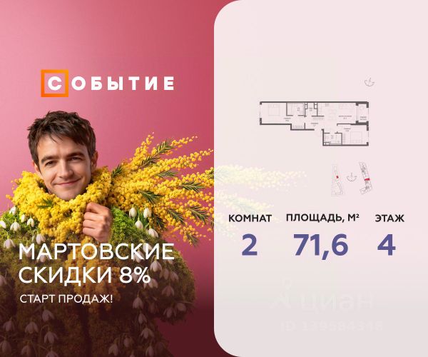 Весь март - скидка до 8% действует до 31.03.2026 г. при 100% оплате и не субсидированной ипотеке! В продаже 2-к квартира от застройщика. Общая площадь 64.3, жилая 43.7, кухня 20.6. Квартира расположена на 4 этаже жилого квартала "Событие-6", корпус 2, Секция 5. Квартира без отделки. Срок сдачи: 4 кв. 2029 года. СОБЫТИЕ.6 — финальный дом парк-квартала СОБЫТИЕ на Мосфильмовской. Переезжайте в уже сформированный квартал с готовой инфраструктурой и парком! Премиальный жилой комплекс в престижном районе Москвы предлагает стильную архитектуру, продуманное благоустройство и великолепно разнообразие общественных пространств. Свой парк прямо возле дома! Архитектура Архитектура СОБЫТИЯ.6 выполнена в ультрасовременном стиле московским бюро Atrium на основе дизайн-кода британских архитекторов LDA Design и UHA London. Дом отличает оригинальная геометрия фасадов, большое остекление и высокие лобби (до 6,2 м) с авторской мебелью и светильниками. Расположение Мосфильмовская улица (Раменки) — один из престижных районов Москвы. Близость к историческому и деловому центру, природным зонам Запада столицы. Транспортная доступность: • 10 мин до Москва-Сити и ТТК; • 15 мин до Садового кольца; • 25 мин до аэропорта Внуково; • 7-10 мин до станций метро "Аминьевская" и "Мичуринский проспект". Инфраструктура: • парк "Событие" (12 га, финалист конкурса Правительства Москвы) с беговыми (1,5 км) и велодорожками (2,7 км), экотропой (1,6 км), площадками, лекторием; • школа, детский сад, магазины, салоны красоты, рестораны (к моменту заселения); • мультидвор с игровыми и спортивными площадками, мини-бульваром; • общественная терраса на 10-м этаже (коворкинг, лаунж); • Закрытые общественные пространства: детская комната, спортивный зал, коворкинг, лаунж-зоны. Паркинг 256 мест для жителей (48 — для электромобилей), 24 гостевых (5 — для электромобилей), мойки колес, кладовые, зоны для велосипедов. Окружение Парки и заповедники (Воробьёвы горы, Матвеевский лес и др.), МГУ, театр им. Н. И. Сац, стадион "Лужники". Безопасность Видеонаблюдение, контроль доступа, видеодомофоны, консьерж-сервис 24/7, системы пожарной безопасности и мультисервисная оптическая сеть.