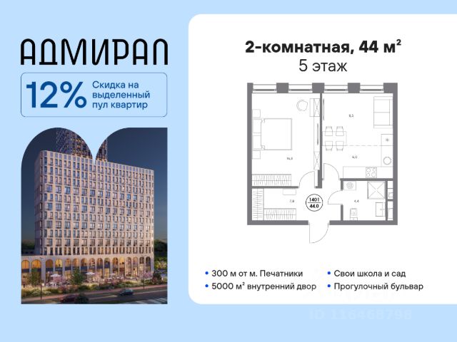 В динамично развивающемся районе Москвы, всего в 300 метрах от метро и в пешей близости от нового городского порта с протяженной набережной 13 км, свободной от автомобилей, продается 2-комнатная квартира площадью 44.00 м². без отделки. Квартира находится в корпусе жилого комплекса бизнес-класса "Адмирал", расположенного по адресу г. Москва, ул. Шоссейная, 4Д. (Застройщик - "Галс Девелопмент"). Новый амбициозный проект "Адмирал" станет частью одного из самых перспективных районов будущего - "Сити-2". В пешей доступности от современных башен Вас ждут живописные Люблинские пруды, 2 усадьбы с уникальной историей и уютный парк "Печатники" у Перервинского плёса. Район имеет отличную транспортную доступность: • 300 метров до станции метро "Печатники"; • Удобная пересадка на БКЛ и станцию МЦД-2; • 10 минут на машине до ТТК; • 15 минут до Садового кольца. Архитектура корпусов отличается динамичностью облика благодаря переменной этажности: высокие башни сочетаются с домами средней этажности. Изящным украшением становятся арочные витражи. Интеллигентный и современный стиль "Адмирала" продолжается в гранд-лобби: пастельные оттенки интерьера и фактурные элементы декора создают атмосферу безмятежного отдыха, особое ощущение простора дарят высокие потолки до 4 м и витражные окна. В домах предусмотрено от трех до шести скоростных лифтов, каждый из них спускается на любой этаж подземного паркинга и обладает удобными сенсорными панелями управления и низким уровнем шума. Благоустроенный двор площадью 5000 кв.м. украсят десятки видов гипоаллергенных растений. Здесь можно совершить приятный променад, по пути заглядывая за свежезаваренным кофе, уединиться за ноутбуком в комфортном коворкинге, занять ребенка играми в двухъярусном плейхабе или помедитировать на специальной площадке для йоги. Мягкий свет декоративных фонарей подчеркнет живописность местности, а чувство безопасности гарантируют круглосуточные системы видеонаблюдения. Дополнительные преимущества: • Высокие потолки от 2,9 до 3,25 м; • Бизнес-центр, школа и детский сад прямо на территории дома; • Подземный двухуровневый паркинг на 1955 машино-мест; • Кладовые помещения в тёплом контуре на 2м этаже; • Стрит-ритейл на первых этажах.
