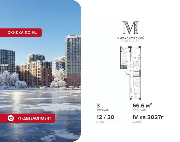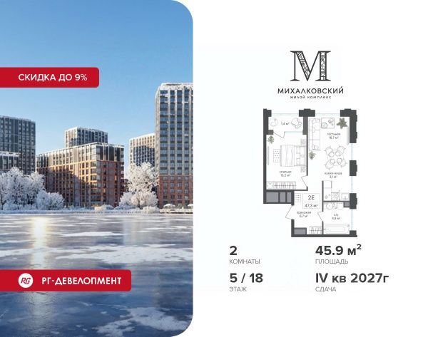 Скидка 9% при покупке квартиры! Продаётся 2-к квартира 45,9 кв.м. в ЖК "Михалковский" на 5-м этаже 18 этажного дома. Ипотека для каждого! Полная стоимость кредита от 13,192% до 17,149%. Ставка от 0,11% в АО "Альфа-Банк", ген. лицензия ЦБ РФ 1326 от 16.01.2015. Ставка фиксируется на первые 12 месяцев, далее полная стоимость кредита от 22,022% до 24,599% ставка 21,59%. Первоначальный взнос — от 20,1% от стоимости квартиры. Срок кредитования — от 4 до 30 лет. Компания "РГ-Девелопмент" предоставляет скидку на квартиры в жилом комплексе. Акция действительна до 15.03.2026 включительно. Для того чтобы воспользоваться предложением, необходимо подписать договор на приобретение недвижимости до 15.03.2026 включительно. Действует программа "Растет семья - растет и квартира". Компания "РГ-Девелопмент" вошла в ТОП-10 девелоперов по объёму введённого жилья в "Старой Москве" по итогам 2025 года. Прямая продажа от застройщика! Квартиры без отделки. Срок сдачи IV кв. 2027г. Особенности проекта: Завораживающие виды Красивое благоустройство Уникальная локация для Москвы (рядом Головинский парк, пруды, усадьба Михалково) Рядом с центром В проекте присутствует: архитектура голландского бюро MLA+, зеленые зоны, транспортная доступность, благоустроенная территория, подземный паркинг, детский сад и выход на Головинский парк с пятью прудами. Название комплекса указывает на одну из его черт - соседство с имением Михалково. Позвольте себе жить в месте, где проводили свой досуг династии Дашковых и Паниных.