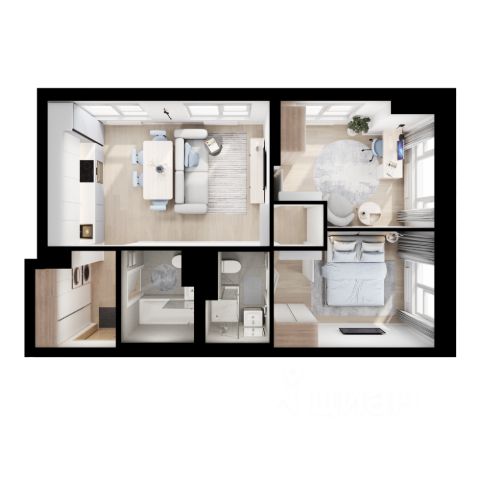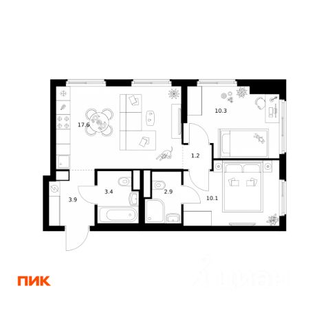 Квартира с кухней-гостиной и двумя спальнями в квартале "Метроном". Особенности планировки: балкон, вид во двор, мастер-спальня, предчистовая отделка. квартиры в нашей базе: КВМ-КВМ01-5-5.5.4.