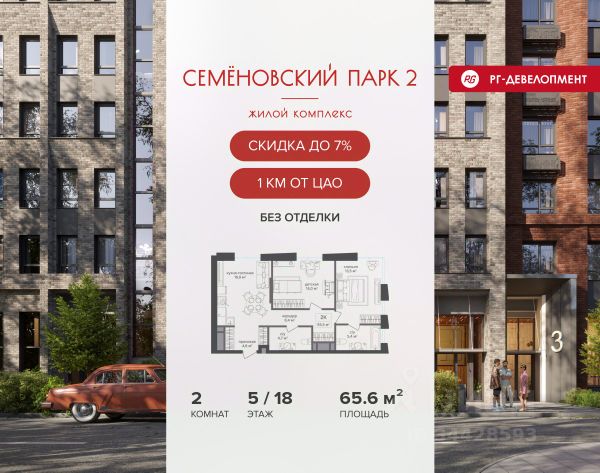 Ипотека для каждого! Полная стоимость кредита от 12,380% до 18,537%. Ставка от 0,11% в АО "Альфа-Банк", ген. лицензия ЦБ РФ 1326 от 16.01.2015. Ставка фиксируется на первые 12 месяцев, далее полная стоимость кредита от 22,022% до 24,599% ставка 21,59%. Первоначальный взнос — от 20,1% от стоимости квартиры. Срок кредитования — от 4 до 30 лет. Ипотека на весь срок! Полная стоимость кредита от 23,396% до 26,058% со ставкой 14,5%! Первоначальный взнос —от 20,01% от стоимости квартиры. Срок кредитования — от 3 до 30 лет. АО "Банк ДОМ.РФ" универсальная лицензия Банка России 2312 от 19.12.2018. Скидка 7% при покупке квартиры! Цена указана с учетом максимального размера скидки. Продается 2-к квартира 65,6 кв.м. в ЖК "Семеновский парк 2" на 5-м этаже 18 этажного дома. Компания "РГ-Девелопмент" предоставляет скидку на квартиры в жилом комплексе. Акция действительна до 15.04.2026 включительно. Чтобы воспользоваться предложением, необходимо подписать договор на приобретение недвижимости до 15.04.2026 включительно. Компания "РГ-Девелопмент" вошла в ТОП-10 девелоперов по объёму введённого жилья в "Старой Москве" по итогам 2025 года. Прямая продажа от застройщика! Квартиры без отделки. Срок сдачи корпуса - 1 кв. 2026 г., корпус сдан. Выдача ключей. ЖК "Семеновский парк 2" - это идеальное место для того, чтобы стать вашим домом. Проект расположен в исторической части Москвы вблизи Измайловского лесопарка, в 1 км от ЦАО. 4 станции метро отделяют вас от Красной площади и 15 минут на автомобиле - от Садового кольца.