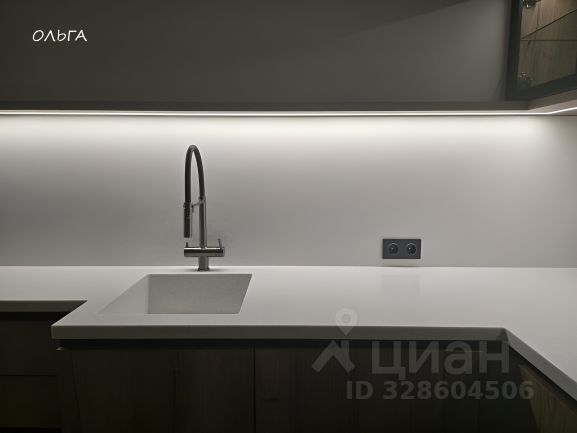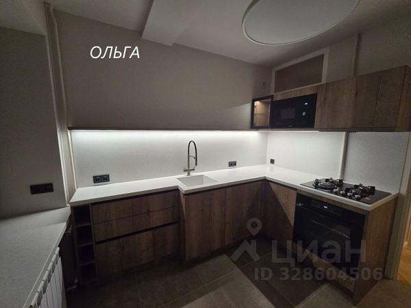 В кухне установлена стильная качественная мебель, выполненная на заказ, с удобными системами хранения, встроенными шкафами, встроенной техникой Gorenje. Подоконники и столешница на кухне выполнены из искусственного камня.