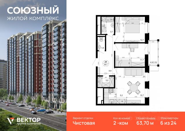 Продается 2-комн. квартира площадью 63,7 кв.м на 6 этаже 24 этажного дома в ЖК "Союзный" от федерального девелопера ГК "Вектор". Расположение, транспортная доступность Жилой комплекс "Союзный" — это квартал из 6 монолитных домов комфорт-класса высотой до 25 этажей, строящийся в 8-ом микрорайоне города Одинцово на улице Маковского. В продаже квартиры площадью от 37,2 до 88 кв. м, с потолками высотой 2,7 м, лоджиями, 2-мя санузлами в квартирах с 3-мя комнатами. Квартиры без отделки и с отделкой эконом, бизнес или комфорт класса. Квартал располагается на территории с отличной транспортной доступностью: - 8 км от МКАД; - 15 минут пешком до станции "Одинцово" МЦД-1; - рядом находится автобусная остановка, от которой можно доехать до метро "Парк Победы", "Киевская", "Юго-Западная"; На личном автотранспорте доехать от комплекса по Минскому шоссе к новой развязке с МКАД можно примерно за 20 минут. В качестве альтернативы можно выбрать Можайское шоссе. Даже в час пик передвигаться по нему можно со скоростью 50 км/ч. Кроме того, можно выбрать платную трассу Северный обход Одинцово. Путь от квартала до Северо-Западной хорды на автомобиле займет 25-35 минут, а до ТТК и Садового кольца - 1 час. В квартале запланировано строительство торгового центра, детского сада на 245 мест (сдача - 4 кв 2025 г.), многоуровневой открытой стоянки на 257 автомобилей, многоуровневого подземного паркинга, наземно-подземного паркинга с эксплуатируемой кровлей и других объектов. На внутренней территории квартала разместятся детский игровой комплекс с резиновым покрытием, спортплощадка, зоны отдыха для взрослых, деревья, кустарники и газоны. В шаговой доступности от ЖК "Союзный" располагаются школа, детский сад, профучилище, несколько ТЦ, кинотеатр "Юность", Ледовый дворец, сквер Союзный, Глазынинский пруд с качелями и площадкой для хоккея. В районе ЖК нет промышленных производств, а совсем близко начинаются лесные массивы, занимающие площадь свыше 70 000 га. Этот район считается одним из самых экологически чистых в Подмосковье.*