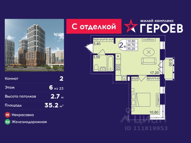 Продаётся 2-комнатная квартира 41.3 кв. м. в жилом комплексе "Героев" в Балашихе, Железнодорожный. Квартира расположена на 6 этаже 611 корпуса. Все квартиры представлены с чистовой отделкой. Вам не нужно тратить время и дополнительные финансы на ремонт или жить в шуме строительных работ - достаточно перевести свои вещи, расставить мебель и всё готово! Жилой квартал "Героев" - это уютный проект для семей с детьми. Всего 40 минут до центра Москвы. В квартале созданы все условия для досуга всех возрастов: игровые и спортивные площадки, места для отдыха и прогулок, магазины, кафе и пункты выдачи. За 15 минут можно дойти от дома до Ольгинского лесопарка - популярного места для прогулок и отдыха на свежем воздухе. Здесь приятно гулять всей семьёй, заниматься спортом или устроить пикник в выходной день. Преимущества: Квартира с готовой отделкой. Пространство полностью подготовлено для жизни: не нужно тратить время и деньги на ремонт или ждать его окончания. После получения ключей достаточно расставить мебель - и можно сразу заезжать и жить. Продуманные и светлые планировки. Просторные кухни-гостиные создают комфортное пространство для отдыха и встреч с близкими. В квартирах предусмотрены удобные гардеробные, благодаря чему легко поддерживать порядок и не перегружать комнаты шкафами. Увеличенное остекление. Большие окна наполняют квартиру естественным светом в течение всего дня, создавая ощущение простора и уюта, а также визуально расширяя пространство и делая интерьер более воздушным. Пешая доступность до станции Железнодорожная (МЦД-4) - дорога займёт не более 30 минут до центра Москвы: станции метро "Курская", "Площадь Ильича" или ТПУ Нижегородская.