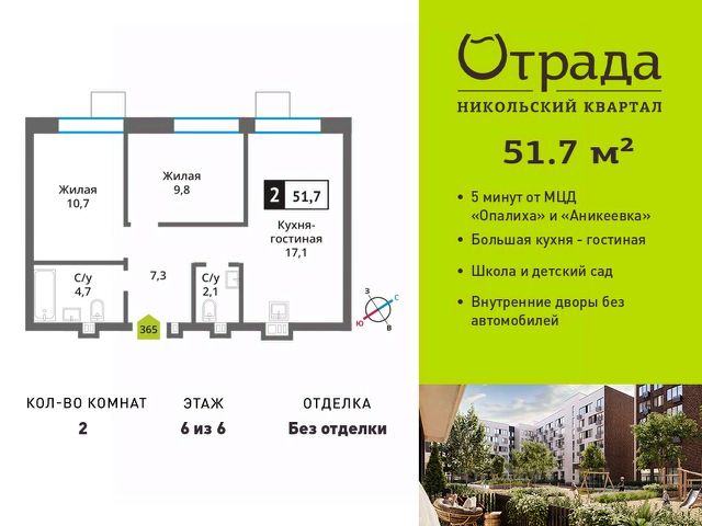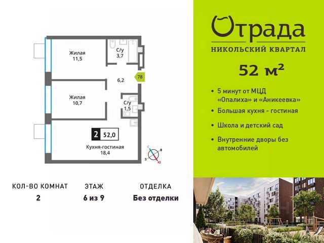 Двухкомнатная квартира (евротрешка) с просторной кухней-гостиной Двухкомнатная квартира (евротрешка) с просторной кухней-гостиной в жилом комплексе комфорт-класса "Никольский квартал Отрада". Планировка выполнена по современным стандартам и отличается повышенным комфортом. Квартал расположен в удачной локации, которая сочетает благоприятную экологическую обстановку с прекрасной транспортной доступностью. Проектом предусмотрены 14 корпусов высотой 6-9 этажей, а также муниципальная школа, один муниципальный и один частный детский сад, два наземных многоуровневых паркинга с кладовыми помещениями. Надежный застройщик ГК "Отрада" с высочайшим рейтингом 5 звезд от портала ЕРЗ. Все корпуса во всех ЖК сданы раньше срока!