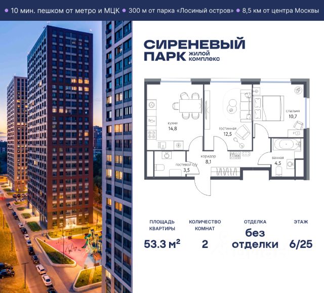 Продаётся просторная 2-комнатная квартира общей площадью 53.3 м² на 6 этаже в новом жилом комплексе "Сиреневый парк", расположенном в Восточном административном округе Москвы на улице Тагильская. Всего 10 минут ходьбы от станции метро "Бульвар Рокоссовского" и одноимённой платформы МЦК. Высококачественное монолитное строительство гарантирует сохранение тепла в доме, а наличие квартир с предчистовой и чистовой отделкой позволяет вам сэкономить время и сразу же переехать в свое жилье после покупки. Благодаря разнообразию планировок вы сможете выбрать идеальный вариант, соответствующий вашим предпочтениям и образу жизни. Предлагаются квартиры: - с просторными кухнями-гостиными, - с нишами для хранения вещей и отдельными гардеробными, - мастер-спальни с собственными санузлами, - большие комнаты с высокими потолками (2,9 м) и с увеличенными безопасными окнами (1,95 м) , которые наполнят ваш дом естественным светом; - с чистовой отделкой по двум дизайн-проектам на выбор; - с остекленными лоджиями и панорамными видами на лес. Каждая деталь в этом доме создана для вашего комфорта: - безбарьерная среда, - бесшумные скоростные лифты, - машиноместа в отапливаемом подземном паркинге и кладовые на -1 этаже с доступом из лифта, - развитая инфраструктура с супермаркетами, кафе, фитнес-клубами, салонами красоты и частным детским садом обеспечивает максимальное удобство жителям. В 300 метрах от ЖК расположен Национальный парк "Лосиный остров". Способы покупки: 100%, Trade-in, Семейная ипотека без наценки, стандартная ипотека. Запишитесь на просмотр в офис продаж и получите свою персональную скидку по акции Назови свою скидку. ЖК "Сиреневый парк" — гармония в деталях, совершенство в каждом моменте. Застройщик проекта - AFI Development.