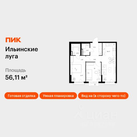 Продаётся 2-комн. квартира площадью 56,11 кв.м на 6 этаже 9 этажного дома (Корпус 4.1, Секция 4) проекта ПИК Ильинские луга. Светлый просторный подъезд на уровне земли, функциональная планировка, большие окна, c отделкой. Жилой район "Ильинские луга" находится в 10 километрах от МКАД по Новорижскому шоссе, в 20 минутах на автомобиле от станций метро "Волоколамская", "Тушинская" и "Строгино". В будущем ближе к проекту, в 9 минутах пути на машине, откроется станция "Ильинская" Рублёво-Архангельской линии, которая будет соединять Арбатско-Покровскую линию и Большую кольцевую линию. Сейчас в квартале начались продажи в корпусах 3.2, 3.3, 3.4, 3.5 и 3.6. "Ильинские луга" — масштабный проект, в который входит девять детских садов, четыре школы и поликлиника. Он строится в престижном и экологичном районе среди лесов и памятников природы. За 5 минут от жилого квартала можно доехать до Рублёво-Успенского шоссе, а за 30 минут — до центра Москвы. До крупного торгового центра "РИГАМОЛЛ" всего 5 минут на автомобиле, а до ТЦ "Твой дом" и гипермаркета "Глобус" — 10 минут. В "Ильинских лугах" строятся только девятиэтажные дома — такая архитектура соответствует спокойной жизни за городом. В каждом дворе-парке есть места для отдыха, детские и спортивные площадки. А ещё, здесь уже открыт большой PlayHub "Гравити" — современное игровое пространство с космической тематикой, холмами, зонами для игр и отдыха жителей любого возраста. На первых этажах уже работают магазины, кафе и пекарни. Места для отдыха от "Ильинских лугов" тоже недалеко: 10 минут на машине — и вы в музее-усадьбе "Архангельское". Также рядом находится Лохин остров — памятник природы, где водятся речные черепахи, есть места для кемпинга и возможность сплавиться по реке. Артикул 1016088 (Застройщик ООО "СЗ "ГРАДОЛИМП")
