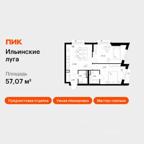 Продаётся 2-комн. квартира площадью 57,07 кв.м на 6 этаже 9 этажного дома (Корпус 4.2, Секция 5) проекта ПИК Ильинские луга. Светлый просторный подъезд на уровне земли, функциональная планировка, большие окна, предчистовая отделка. Жилой район "Ильинские луга" находится в 10 километрах от МКАД по Новорижскому шоссе, в 20 минутах на автомобиле от станций метро "Волоколамская", "Тушинская" и "Строгино". В будущем ближе к проекту, в 9 минутах пути на машине, откроется станция "Ильинская" Рублёво-Архангельской линии, которая будет соединять Арбатско-Покровскую линию и Большую кольцевую линию. Сейчас в квартале начались продажи в корпусах 3.2, 3.3, 3.4, 3.5 и 3.6. "Ильинские луга" — масштабный проект, в который входит девять детских садов, четыре школы и поликлиника. Он строится в престижном и экологичном районе среди лесов и памятников природы. За 5 минут от жилого квартала можно доехать до Рублёво-Успенского шоссе, а за 30 минут — до центра Москвы. До крупного торгового центра "РИГАМОЛЛ" всего 5 минут на автомобиле, а до ТЦ "Твой дом" и гипермаркета "Глобус" — 10 минут. В "Ильинских лугах" строятся только девятиэтажные дома — такая архитектура соответствует спокойной жизни за городом. В каждом дворе-парке есть места для отдыха, детские и спортивные площадки. А ещё, здесь уже открыт большой PlayHub "Гравити" — современное игровое пространство с космической тематикой, холмами, зонами для игр и отдыха жителей любого возраста. На первых этажах уже работают магазины, кафе и пекарни. Места для отдыха от "Ильинских лугов" тоже недалеко: 10 минут на машине — и вы в музее-усадьбе "Архангельское". Также рядом находится Лохин остров — памятник природы, где водятся речные черепахи, есть места для кемпинга и возможность сплавиться по реке. Артикул 1015626 (Застройщик ООО "СЗ "ГРАДОЛИМП")