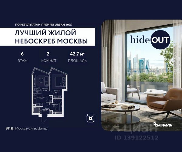 Прямая продажа от застройщика. Продается 2-комнатная квартира площадью 42.7 кв.м. на 8-м этаже 34-этажного дома в ЖК hideOUT с панорамными видами: Во двор. Высота потолков 3,25 м. hideOUT — премиальный проект компании Dominanta. Это новый уровень жизни и комфорта без компромиссов. Две башни — 34 и 49 этажей — открывают захватывающие виды на Москву. Архитектурной доминантой проекта становится мост, соединяющий башни на высоте 80 метров. Закрытая территория, охрана 24/7, зона экстренной безопасности на подземном уровне, система пожаротушения. На мосту между башнями на 22-м этаже находится SocialHUB — предусмотрено 16 комфортных пространств для работы, отдыха и развлечений с панорамными видами и клубным форматом доступа. Концепция благоустройства hideOUT — баланс между природой и технологичным городом будущего. На территории сада предусмотрены 15 зон для отдыха, работы, спорта и детей. Знаковым местом станет центральная площадь с амфитеатром и водопадом — сочетание камней, растений и струящейся воды создает идеальный баланс с природой. В проекте действуют привлекательные условия покупки: - скидка до 20% при 100% оплате стоимости лота и ипотеке без субсидирования. Предложение действует до 28.02.2026. - рассрочка 0% на 12 месяцев с первоначальным взносом 30% / на 18 месяцев с первоначальным взносом 50%. Застройщик АО "СЗ "ХАЙДАУТ", ИНН 7729058636, ОГРН 1027739319420. Проектная декларация на сайте наш.дом.рф. Предложение не является публичной офертой.
