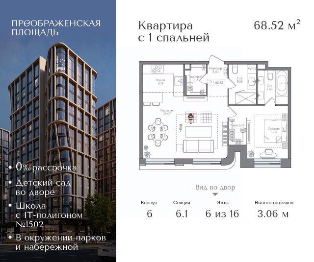 Рассрочка 0% от застройщика. Первоначальный взнос от 20%. Предложение действует до 31 января 2026 года Квартира на 6 этаже в жилом комплексе премиум-класса "Преображенская площадь". Общая площадь: 62.74 кв.м. Проект премиум-класса в историческом районе Москвы. До метро "Преображенская площадь" 3 минуты пешком. Квартиры сдаются без отделки и в свободной планировке, чтобы жители могли оформить пространство с учетом своей индивидуальности. Высота потолков от 3,15м, широкоформатное остекление, 3-5 квартир на этаже. Система Умный дом. Дизайнерские лобби. Внутренний двор 1,5 га функциональное и безопасное пространство для игр, работы и занятий спортом. Пешеходный променад для прогулок. Дома переменной этажности. Есть подземный паркинг. Жилой комлекс находится в окружении парков Сокольники, Черкизовский, Измайловский, заповедника Лосиный остров и ВДНХ, а также вблизи пешеходной набережной. Комфортная удаленность от центра: 7 минут на автомобиле до ТТК, 8 минут до Садового кольца, 25 минут до Кремля.