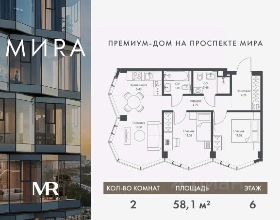 Прямая продажа от застройщика. Продаётся 2-комнатная квартира общей площадью 58.14 м² без отделки в доме премиум-класса МИRА на 6-м этаже 24 этажного дома. Квартира расположена в корпусе 3. Дом премиум-класса МИRA это: • Спокойный район с богатой историей и сложившейся инфраструктурой • Авторская архитектура на стыке классики и современности • Вход в парк прямо из жилого комплекса • Панорамные виды на Яузу, парки, ВДНХ и скульптуру "Рабочий и колхозница" • Удобные сервисы и безопасность для каждого резидента Расположение: Жилой квартал расположен в Алексеевском районе на северо-востоке Москвы, на второй линии домов, таким образом вы сможете дистанцироваться от шума и суеты проспекта Мира, но при этом будете жить недалеко от этой важной городской магистрали. Прямо у дома: • Парк Акведук • Река Яуза • Памятник "Рабочий и колхозница" Пешком: • 16 мин м. ВДНХ На автомобиле: • 12 мин ТТК • 15 мин Садовое кольцо • 12 мин Национальный парк "Лосиный остров" Благоустройство: Концепция благоустройства от бюро "ДРУЖБА" разработана в стиле "Лесная тропа". В уютном дворе расположились словно затерянные в лесу, площадки для отдыха. Они разделяются островками с травами, кустарниками, крупными камнями и деревьями, между которыми проходят узкие песчаные тропинки с деликатной подсветкой по вечерам. Центральной точкой притяжения для жителей станет главная площадь с фонтаном, которая открывается сразу из двух входных групп. Внутренний двор МИRA: • Детская площадка с зонами для игр малышей до трех лет и детей более старшего возраста • Спортивная площадка с профессиональным оборудованием для тренировок • Декоративные перголы • Воздушный арт-объект с подсветкой, похожий на облако • Чайный домик, где в отдельном отапливаемом павильоне можно в любое время года попить кофе с соседями или устроить камерное семейное чаепитие • Зоны для работы и отдыха с гамаком под навесом, скамейками и креслами Инфраструктура и окружение: В Алексеевском районе есть огромные благоустроенные парки, магазины, гимназии с высоким рейтингом и филиалы ВУЗов, частные и государственные детские сады, модные кофейни и фитнес-центры. В квартале МИRА предусмотрены: • 2 ресторана с видом на парк Акведук • 3 кафе • фитнес-студия • подземный паркинг на 330 машино-мест Компания MR предлагает своим клиентам специальные условия приобретения квартир в рамках программ ипотечного кредитования от банков-партнеров.