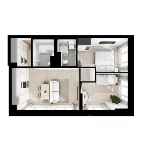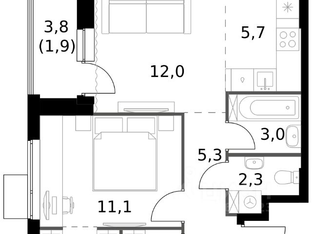 Квартира с кухней-гостиной и двумя спальнями в квартале "Метроном". Особенности планировки: балкон, второй санузел, окна в пол, предчистовая отделка, разнесённые спальни. квартиры в нашей базе: КВМ-КВМ02-9-9.6.6.