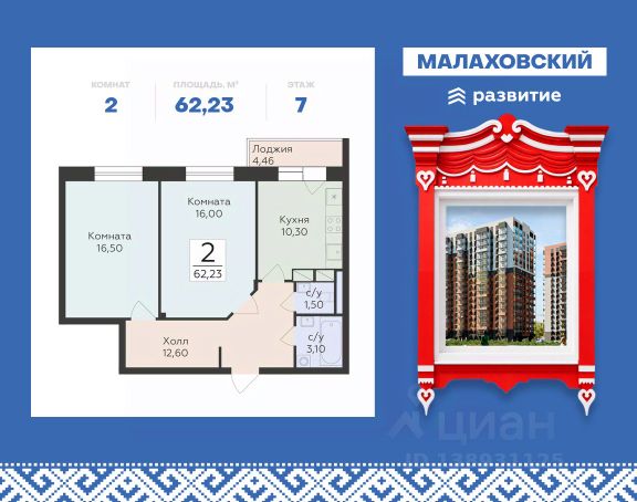 Продается 2-к квартира площадью 62.23 кв. м с черновой отделкой. Квартира расположена на 7 этаже 17 этажного дома, в 203 корпусе. "Малаховский" - жилой комплекс в Раменском районе Подмосковья, идеально подходящий для семей с детьми. Проект от федерального застройщика ГК "Развитие" находится в тихом и зеленом микрорайоне Родники и отличается удобной транспортной связью с Москвой и Люберцами. Три дома высотой 17 этажей с видами на озеро и парк, просторные квартиры, приватный двор-патио с ландшафтным дизайном и доступная инфраструктура обеспечат жителям новых квартир все преимущества городской жизни в живописном природном окружении. Транспортная доступность - Удобный выезд на Егорьевское шоссе и строящуюся магистраль МЕТК (Москва - Егорьевск - Тума - Касимов); - 18 км от МКАД; - 5 мин. до МЦД-3 "Удельная"; - 29 мин. до метро "Лермонтовский проспект". Архитектура Дома отличаются высокой тепло- и шумоизоляцией, долговечностью, высоким уровнем энергоэффективности и современным внешним видом. Фасады выполнены в спокойной цветовой гамме. Из окон с широкоформатным остеклением открываются виды на березовую рощу, озеро и зеленые дворы. Логичным продолжением архитектуры становятся просторные входные группы, где продумано всё: витражное остекление, высокие потолки, дизайнерская отделка, два выхода на обе стороны дома, а также современные лифты (грузовой и пассажирский) и колясочные. Планировочные решения Планировки комплекса "Малаховский" функциональны и эргономичны, что упрощает зонирование и расстановку мебели. Квартиры оснащены гардеробными, лоджиями с панорамным остеклением, двумя санузлами (даже в однокомнатных) и просторными прихожими. Высота потолков - 2,7 м. Квартиры сдаются с отделкой white box, которая позволит воплотить индивидуальный дизайн-проект по своему вкусу. Доступны варианты отделки "под ключ" с применением лучших дизайнерских материалов. Благоустройство В жилом комплексе тщательно продумана концепция благоустройства. Через всю территорию тянутся живописные прогулочные бульвары с ландшафтным дизайном и всесезонным озеленением. Рядом обустроено 3 современных детских площадки с мягким покрытием, а для взрослых предусмотрены уютные лаунж-зоны для общения, тихого отдыха и спорта на свежем воздухе. Двор каждого дома свободен от машин, а для дополнительного уюта и безопасности здесь установлено современное освещение. Естественным продолжением дворового ландшафта становится березовая роща с природными тропинками и небольшим водоемом, прилегающая к жилому комплексу. Инфраструктура и окружение - Наземный паркинг на 55 машино-мест и гостевая парковка; - Все повседневные сервисы (кафе, магазины, салоны красоты) прямо в вашем доме; - Фитнес-клуб, бассейн, спортивные площадки и велодорожки в многочисленных парках микрорайона Родники; - 2 школы, гимназия и детский сад в шаговой доступности; - ТЦ "Родники" с рестораном и супермаркетом; - Петропавловский парк с благоустроенным детским городком и волейбольной площадко